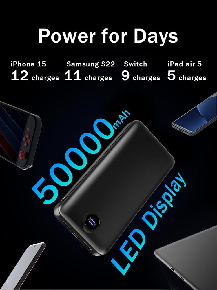 Power Bank High Capacity 50000mAh The 50000mAh portable charger external battery power bank provides 12 charges for iPhone15, 11 times for Samsung S22. Depending on battery size, most smartphones will get more 10 full charges. Suitable for camping, hiking, fishing vacation, travel and other outdoors activities and emergencies. 22.5W Super Fast Charging 50000mAh battery bank adopts the QC3.0 / PD3.0 / SCP Protocol with max 22.5W output USB port,Compatible with more fast-charging phones, High-capacity cell phone portable power banks with quick charging, it only takes 30 minutes to charge iPhone 15 up to 75%, which is 3.2 times faster than most old 10W power banks on the market. Portable Charger with 3 Outputs and 2 Inputs Battery pack provides 2 Inputs (Micro and Type C ports), we can flexibly match different types of charging cables; 3 outputs (2 USB & 1 and Type-CType C ports), Which makes we to share the powerbank with workmates, friends or family, charging 3 devices at the same time, compatible with smart phone, Tablet PC, mini speakers, smartwatch,headsets, cameras, game consoles High-tech Safety Power Bank For battery bank, from fireproof housing to High-tech chips,which can maximize the life of power bank and device.Portable battery charger with safety protection designs for overcharge,over-discharge and overheating etc.No need to worry about high temperature,extrusion,etc. PDBEST only supplies safe and reliable products. LED Digital Display Battery Pack Portable battery power battery pack supply equipped with LED digital display accurately display the remaining power, no need to worry about the unknown power, Struggling with whether to charge the battery, a better grasp of the charging time, more relaxed life.