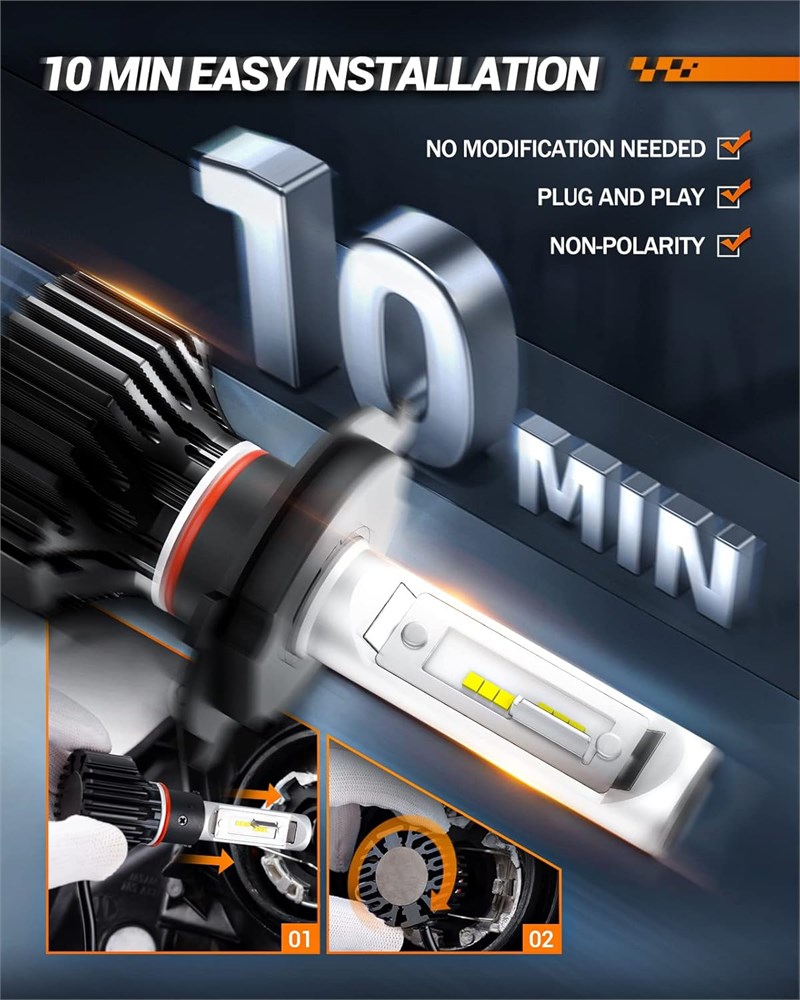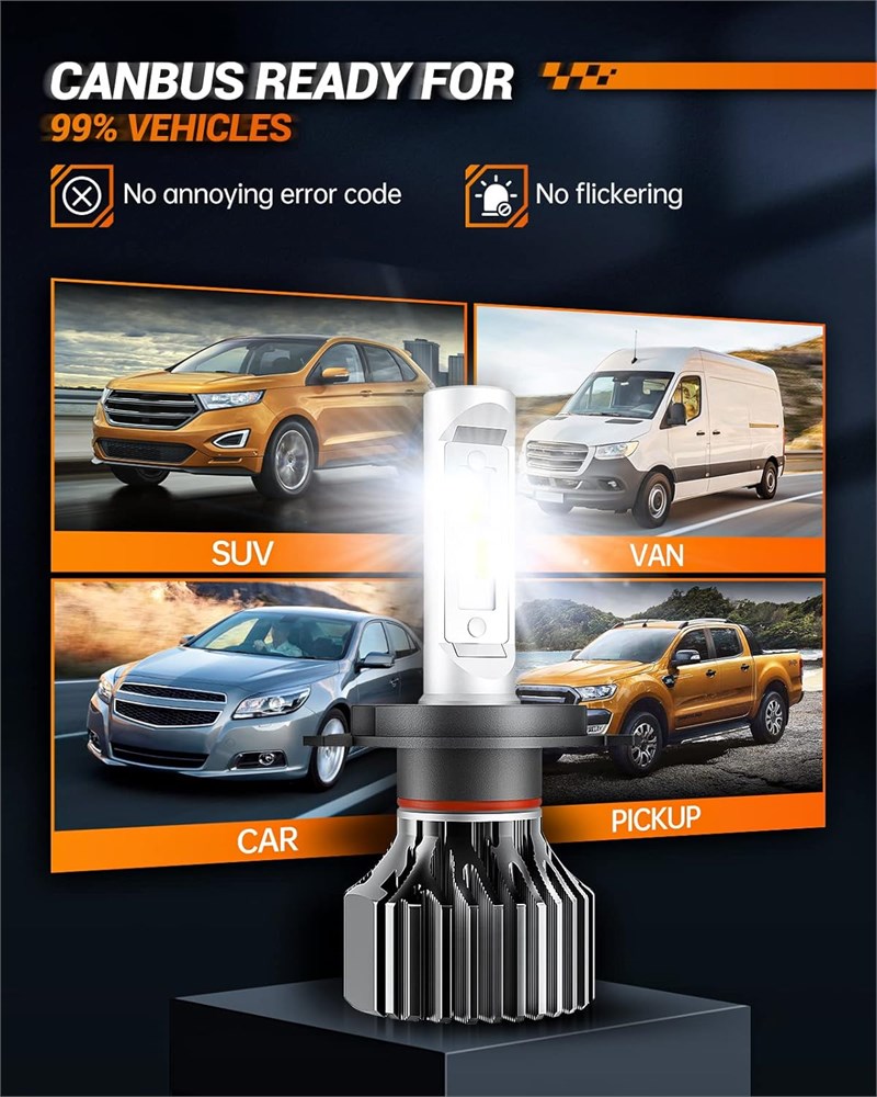 600% Brighter Than Halogens Sealight H4 led headlight bulbs equipped with the latest high-grade CSP chips to own 6000K cool white light with better contrast than the warm, yellow light of halogens. H4 led combo kit gains 3S more brake response to road hazards. 1:1 Perfect Beam Pattern The ultra-thin 0.04-inch copper board reduced glaring to for a Super-Focused beam without any dark spots, ensuring a better and safer driving experience. Compact Fanless Design Free from fan failure and radio interference, the low high beam 9003 LED bulbs feature a smart cooling driver. You can enjoy your driving pleasure without annoying noise. Over 50,000-HR Lifespan Whole solid one-piece aviation aluminum lamp body and IP67 waterproof rate, ensure more than 50,000 hours of continuous lighting, no fears of driving at night or adverse weather. Fits 99% of Vehicles 2 Pack 9003 led bulbs along with built-in CAN Bus to avoid error warnings and radio interference. PLEASE refer to your vehicle s user manual or search "automotive bulb finder" to confirm bulb type before purchasing.