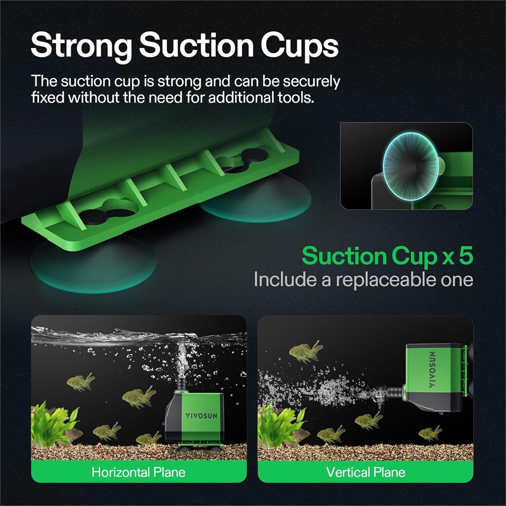 Specs & Dimensions: 4.1*2.6*3.5 inches. The 5 ft. long power cord offers convenient installation and an adjustable knob gives you control of water flow rate and pressure; Max. flow rate: 800 GPH (3000L/H); Max. lift height: up to 10 ft. Wattage: 24W. Voltage: 110-120V Detachable & Cleanable: This powerful yet small-sized water pump is easy to hide and disguise; No tools are necessary for disassembly and it s very easy to clean Many Possible Placement Positions: Place the pump flat on its base, stick it on an angled or vertical surface, and manually rotate it into any position you need Wide Range of Applications: This is a high-performance, energy-efficient pump and is well-designed for use in ponds, fountains, waterfalls, hydroponic systems, and irrigation systems and so on; Working Temperature: 32 to 104 4 Suction Cups: The 4 suction cups are strong and require no extra tools to secure. You can mount it vertically or horizontal, or in any other position based on your needs.