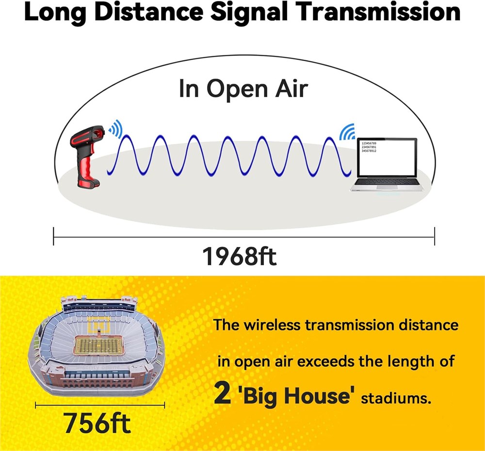 High-Resolution Industrial Scan Engine The Alacrity barcode scanner incorporates a cutting-edge scan module equipped with a high-resolution 1-megapixel optical lens. This advanced technology enables swift and accurate reading of various types of printed barcodes on labels or displayed on mobile phones and computer screens. It excels even when faced with challenges such as labels on shrinkwrap, partial damage, dirt, or poor print quality. Exceptional Signal Range The Alacrity 433MHz RF wireless barcode scanner stands out with its long-distance transmission capabilities. In an unobstructed environment, it can transmit signals up to an impressive 1968 feet (600 meters), and even in environments with obstacles, it reaches a substantial 656 feet (200 meters). This extended range makes it a perfect fit for large warehouses where signal coverage is crucial. Wireless Charging for Ultimate Convenience Experience the freedom of wireless charging by effortlessly placing the scanner on the stand. No software installation or app is needed, ensuring compatibility with Windows, Mac OS, iOS, Android, and a variety of common software like QuickBooks, Word, Excel. This versatile scanner finds applications in supermarkets, cosmetic stores, retail, postal services, logistics, banking, and medical institutions. It's a reliable solution for diverse industries. Industrial-Grade Superior Durability The Alacrity industrial barcode reader boasts exceptional durability with a robust ABS material that provides excellent shockproof capabilities, making it capable of withstanding drops from heights of 8 ft./2.4 m onto concrete floors. Its integrated housing ensures dustproof functionality, protecting the scanner from heavy dust and allowing it to perform reliably in challenging working conditions. Versatile Customized Configuration Options Handsfree Intelligent sensor mode/ Trigger scan mode. Vibration/buzzer settings. Data Storage/Instand Upload Mode. Multiple keyboard languages. Adding / hiding prefix / suffix including date and time, etc.