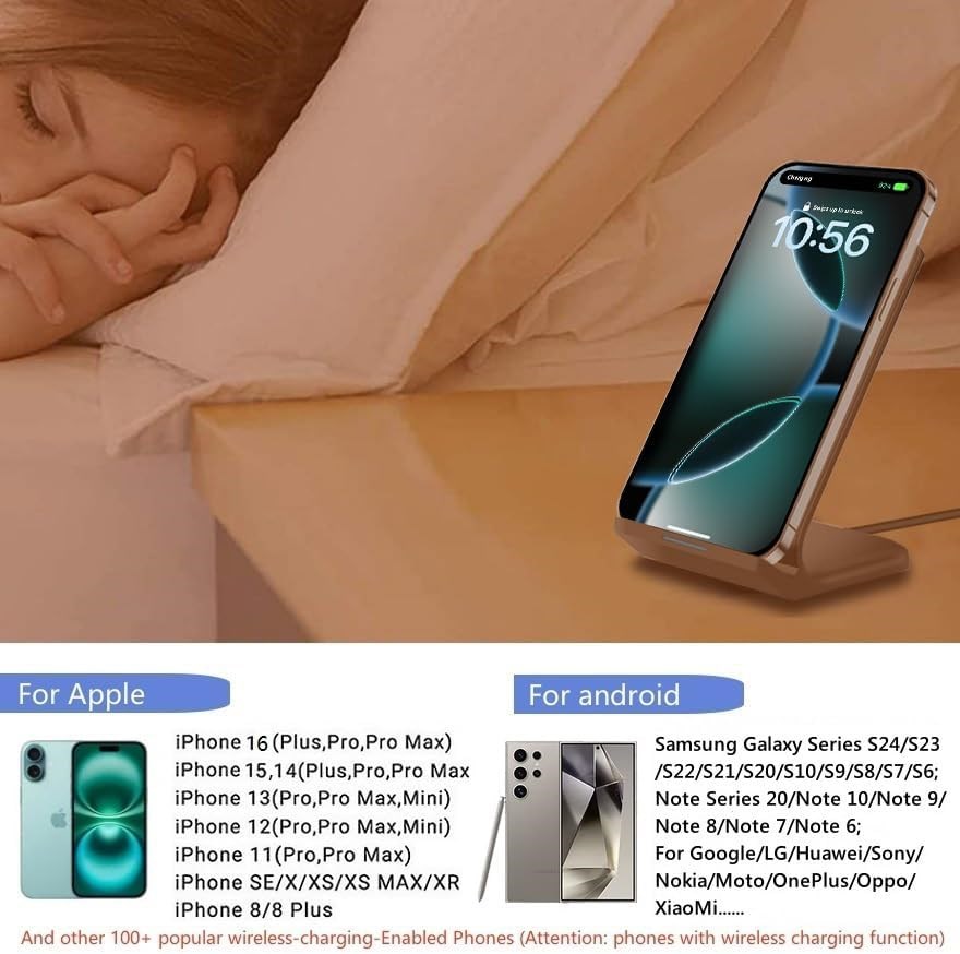 20W Fast Charging: just place your phone on the non-slip charging surface with a free position, enjoy fast wireless charging. supports fast charging speed for iPhones, Samsung phones, and other wireless-charging-enabled phones. Advanced wireless charging technology enables you to charge your device without plugging in a cable. Easy Wireless Charging and Case friendly: The fast wireless charger allows you to charge your device at a higher charging speed which is up to 1.8X faster than standard wireless chargers. Inductive charging directly through protective cases up to 5mm/0.21inch thick (not including cases with magnetic or metal attachments). Perfect Viewing Angles: No more plugging in and out troubles, simply place your phone and enjoy the charging convenience. Small size design for on-the-go easy storage, works as a phone holder whether charging or not, optimized for best viewing and iPhone s Face ID, enjoy movies or play games while charging. Smart Safety: PDKUAI fast charger with over-voltage/ over-current/ temperature control/ short circuit protection/ foreign body detection ensures an ultimate safety charging environment, never overcharges your battery or wastes energy. 2 coils inside for a wider charging range. What You Get: 1 x Wireless Charger stand, 1 x 3.3ft USB-C to USB-C Charging Cable, 1 x 3.3ft USB-A to USB-C Charging Cable, 1*Manual, Package Color Box. Magnetic and metal attachments or cards will prevent charging. (AC adapter Not included)