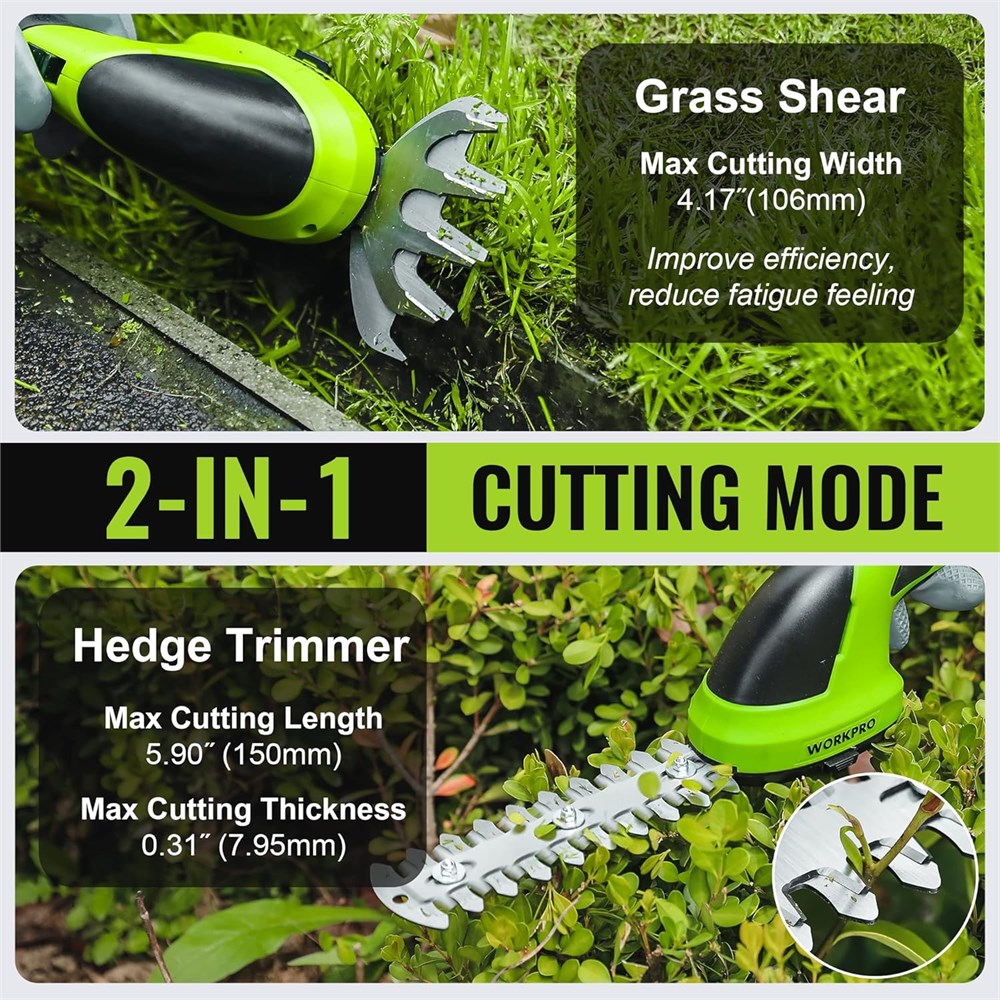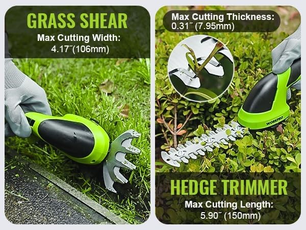 High Performance: 2-in-1 design makes the switch from mowing to hedgerow quick and easy (5.9' long shrub shear and 4.17' wide grass shear). Upgrade power motor provides 1100 rpm no-load speed for best cutting results, which is perfect for Trimming & Pruning: Trees, Branches, Shrubs, Bushes Easy To Use: Lightweight electric hedge cutter and comfortable hand-held grip features an effortless one-handed operation, which create added convenience. Replaceable high-quality blade with innovative blade change - fast easy and safe - no tools required. Note: After using the blade, it need to be cleaned in time and kept dry during storage. Ensure that the blade has a longer life Safe & Reliable: The handheld grass trimmer is designed with a dual lock, which is safe and reliable, and can protect the safety of children & adults whether battery hedge trimmers are working or not. Use your thumb to hold the safety lock on either side of the machine before pressing the on/off switch Compact & Lightweight: Only 0.82 lbs. The compact design of cordless grass cutter ensures that it can fit into a variety of small spaces. Ideal for small gardens, hedge grooming, and areas your mower cannot reach giving. The hedge trimmer blades - suitable for less than 10mm thickness branches Rechargeable & Long Life: The Type-C charging cable makes charging scenes diversified and charging more convenient and faster. The trimmer can be operated for approx 40 minutes with full charge and the lawn mower is approx 50 minutes, and it takes approximately 2-3 hours to fully charge Attention: Recharging per 3-6 months will prolong the life of the cordless grass trimmer if it is not used often.