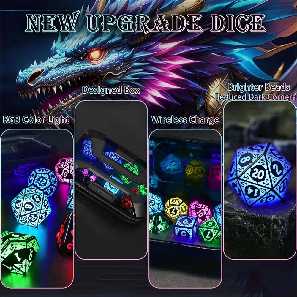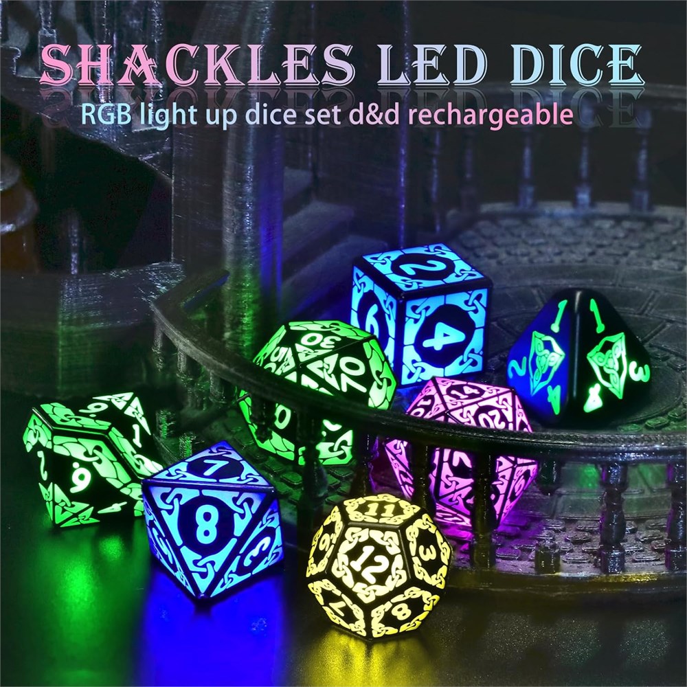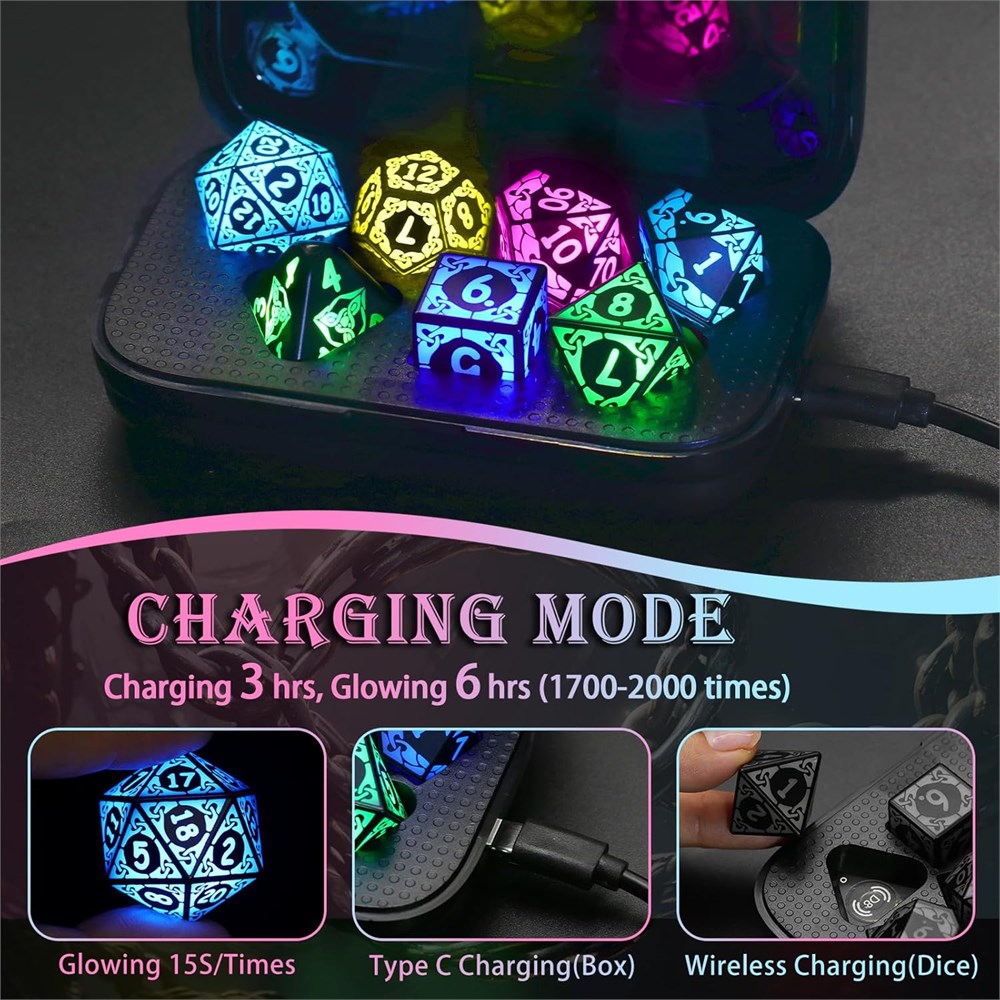 Light Up Dice: Ditch charging hassles! These dnd dice automatically emit a single light every time they are rolled. Charge wirelessly in 3.5hrs for 6hrs of non-stop play, the rechargeable dice status lights (red green) in the transparent case LED Dice Set Rechargeable: Power up dnd dice set instantly: Place the HIGHEST number (D4 = 4 ) facing up in the charging box plug in to charge. Due to vibrations during shipping, d and d dice may run out of power. Please charge after receiving NOTE: When charging, please use the included Type C cable, as the charging case has low power and is not suitable for use with other fast charging cables Cool RGB LED Dice: Ignite your games with shackle-textured glowing dice! They emit intense red,green,blue, etc. rgb glow on impact, making 'critical hits' feel epic as light bleeds through grooves. Your monsters will tremble these aren t just dices set, they re dungeon drama starters Polyhedral D and D Dice: Conquer any RPG with 7 pcs polyhedral dice set rechargeable: D4, D6, D8, D10x2, D12, D20. Lightweight yet balanced for fair rolls, glowing to find mid-dragon fight! Ideal for Dungeons and Dragons, RPGs, or tavern tabletop chaos Unique Dice Surprise DND Gifts: Gifts the unique dice set every gamer craves! Complete with charging case, USB-C cable, and sleek packaging ready for Birthdays, Christmas, Halloween, or critical hit celebrations. Unbox to wow: display as art or unleash in battle.