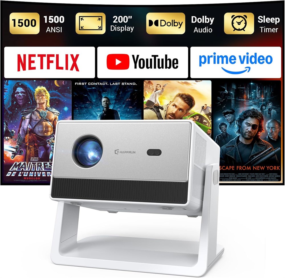 Built-in Streaming System-This smart projector features a built-in Smart TV OS, giving you direct access to millions of videos including officially licensed content from Netflix without the need for an external TV stick. With My App, App Store, and Open Browser, you can easily explore hundreds of preloaded apps or stream videos online. Whether you re binge-watching your favorite series or enjoying the latest blockbuster, unlimited entertainment is always just one tap away. Visionary Picture Quality-With 1500 ANSI lumens and native 1080P resolution, this 4K projector delivers bright, sharp, and vibrant images. HDR10+ technology dynamically optimizes contrast and color for true-to-life visuals in every scene. Enjoy a comfortable viewing experience with reduced glare and minimized eye strain for the whole family. Built-in 180 Projector Stand & Easy Setup-Designed with an all-in-one adjustable stand, this outdoor projector is ready to go wherever you are. No bulky tripods or complicated setup just place it, tilt to the perfect angle, and start watching in seconds. Compact and portable, it s ideal for bedroom movie nights, quick living room setups, or taking to a friend s dorm for a movie party. Remote Batteries Not Included (Please prepare two AAA batteries to get started immediately) Auto Keystone Correction & Manual Focus-Auto focus often fails in dim light or gets distracted by movement. That s why this portable projector is designed with manual focus giving you full control to fine-tune the image exactly how you like it. Combined with auto keystone correction for quick setup, you get both effortless convenience and the reliable precision of hands-on clarity. Cinematic Dolby Audio & Sleep Timer-This bluetooth projector features dual 10W Dolby Audio HiFi stereo speakers with DTS decoding and eARC, delivering clear dialogue, rich bass, and immersive sound. With Bluetooth 5.2, it connects easily to external speakers for flexible upgrades. A built-in sleep timer (10 120 minutes) lets you drift off worry-free, enjoying a simple, relaxing, and energy-saving viewing experience. Up to 200-inch Projection Size -Witness a remarkable explosion of color in bright, beaming detail on the Happrun KC7 expansive 200" projection. With motorized optical zoom, this tv projector easily resize your image from a 40" to a theater-like 200" all in crisp detail. Perfect for movies, gaming, and backyard nights, this netflix projector delivers a flexible, immersive experience anywhere.