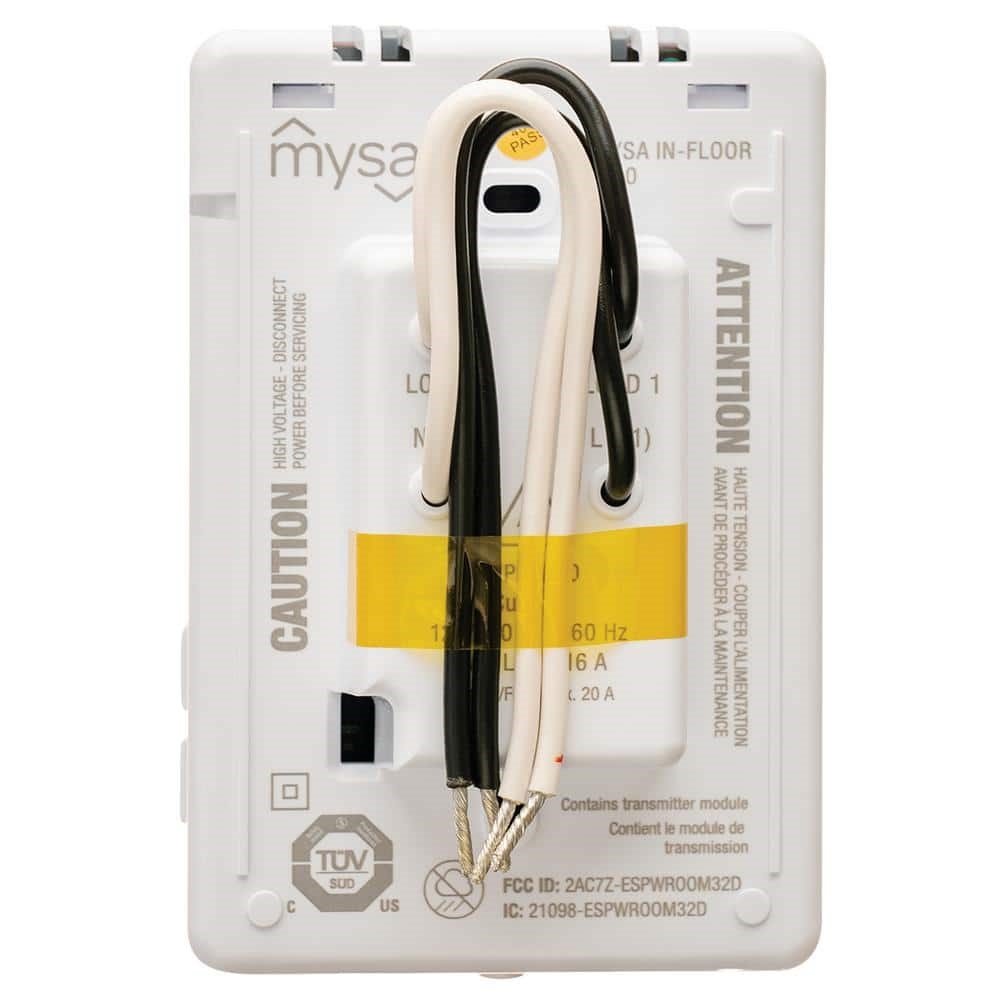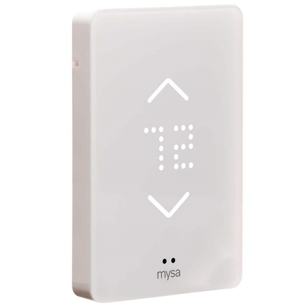 The Mysa Smart Thermostat for Electric In-Floor Heating is the ultimate smart thermostat designed for high voltage in-floor heating to help you save money by using energy more efficiently. Take full control of your heating from anywhere using the Mysa app on your smartphone or tablet and stay conveniently connected with smart home integrations like Alexa, Google Assistant, and Apple HomeKit. Mysa's sleek, minimalist design and premium look subtly enhances your home's style. This Mysa Smart Thermostats installs easily in 20-minutes or less with its step-by-step online guide and video. This thermostat is not compatible with water-based in-floor heating systems or low voltage systems such as 12-Volt/24-Volt oil furnaces, natural gas furnaces, or boilers.. Battery Power Type: N/A. Battery Size: None, Plug-In Only. Color Family: White. Color/Finish: White. Control Type: Phone Controlled,Touchscreen. Features: Lockable,Vacation Mode. Heating & Cooling System Type: 2 Stage. Included: Mounting Hardware. Pack Size: 1. Periods per Programmable Day: 0. Power Options: Hardwired. Returnable: 90-Day. Shape: Rectangle. Smart Technology: Smart Phone/Android App Compatible. Thermostat Compatibility: Baseboard Heater. Thermostat Product Type: Smart/Wi-Fi. Thermostat Shape: Rectangular. Thermostat Type: Heat. Voltage (V): 120/240 V. Voltage Type: Low Voltage. Wire Configuration: 2-Wire. Certifications and Listings: No Certifications or Listings. Display height (in.): 5.1 in. Display width (in.): 3.8 in. Product Depth (in.): .75 in. Product Height (in.): 5.1 in. Thermostat Compatibility: Baseboard Heater. Heating & Cooling System Type: 2 Stage. Thermostat Shape: Rectangular. Wire Configuration: 2-Wire. Features: Lockable. Features: Vacation Mode. Power Options: Hardwired. Control Type: Touchscreen.