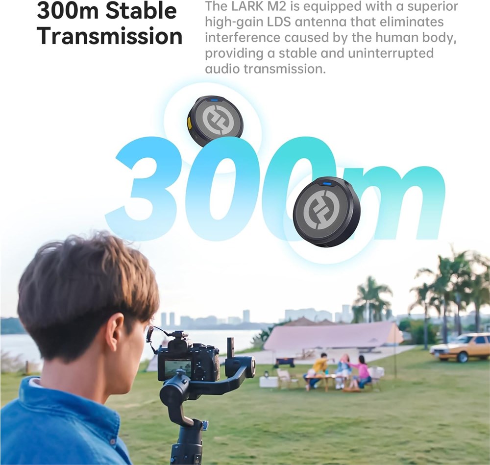 Incredibly Small Weighing just 9g, LARK M2 wireless lavalier microphone is the lightest mini microphone on the market. With its lossless sound reproduction and top-of-the-line recording capabilities, it brings you unmatched recording performance. The wireless audio transmission can reach up to 1,000ft line-of-sight range. Perfect for filmmakers, vloggers, and podcasters. Hi-Fi Studio-Grade Sound Quality Designed for the Pro, LARK M2 microphone features a 48kHz/24bit audio format, capturing every sound with accuracy. With a 70dB signal-to-noise ratio, it ensures excellent audio signals with minimal background noise. Moreover, it can handle a Maximum 115dB Sound Pressure Level, perfect for recording in environments with high-pitched sounds. Smooth Switch Between Mono & Stereo The Lark M2 receiver of the camera version supports two recording modes: mono and stereo. You can switch between them by pressing the Mode Switching & Pairing button on the receiver. Note: The receiver supports switching between mono and stereo modes only when connected to the camera through the 3.5mm audio jack. Smart Control of Noise Cancellation LARK M2 supports one-click on the yellow button to turn on/off the noise cancellation on the transmitter. On the receiver of the camera version, the indicator lights at the top of the RX will stay green when noise cancellation is on. Enhanced firmware and audio algorithms ensure crystal-clear, rich, and undistorted human voices, even in noisy environments. Instant Pairing Upon Unboxing LARK M2 microphone system is pre-paired at the factory, so you won't have to deal with any complex setup procedures. The TX and RX will automatically pair with each other, allowing you to start recording right away. You can easily adjust volume levels on the RX using the intuitive knob. Three LEDs clearly display volume levels, showing the current status. 300m Stable Transmission, Support UAC LARK M2 is equipped with a superior high-gain LDS antenna that eliminates interference caused by the human body, providing a stable and uninterrupted audio transmission of up to 1000ft/300m LOS range. With its UAC function, you can connect the RX to your computer directly, eliminating the need for an external sound card. Plug and Play The LARK M2 wireless microphone system offers a direct plug on the receiver. It eliminates messy wires and provides a truly wireless recording experience. The receiver of the Lightning version boasts an MFi-certified Apple chip, while the USB-C version is designed for Android phones, Apple 15, action cameras, and computers, giving you a clear and crisp sound output.