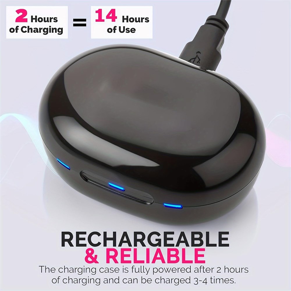 Intuitive One Button Control Press quickly to adjust volume, hold to power on/off. Remembers your favourite settings so you don t have to readjust. Discreet & Comfortable Fit Lightweight, compact, and designed to sit naturally in your ear. Includes soft silicone tips in multiple sizes for a secure, comfortable, and nearly invisible fit. Long Lasting Power Just 2 3 hours of charging gives up to 14 hours of use. The portable charging case stores over 42 hours of extra power. Reconnect with Everyday Life Ideal for mild to moderate hearing loss. Give the gift of clear sound help your loved ones hear conversations and laughter again, and feel more connected.