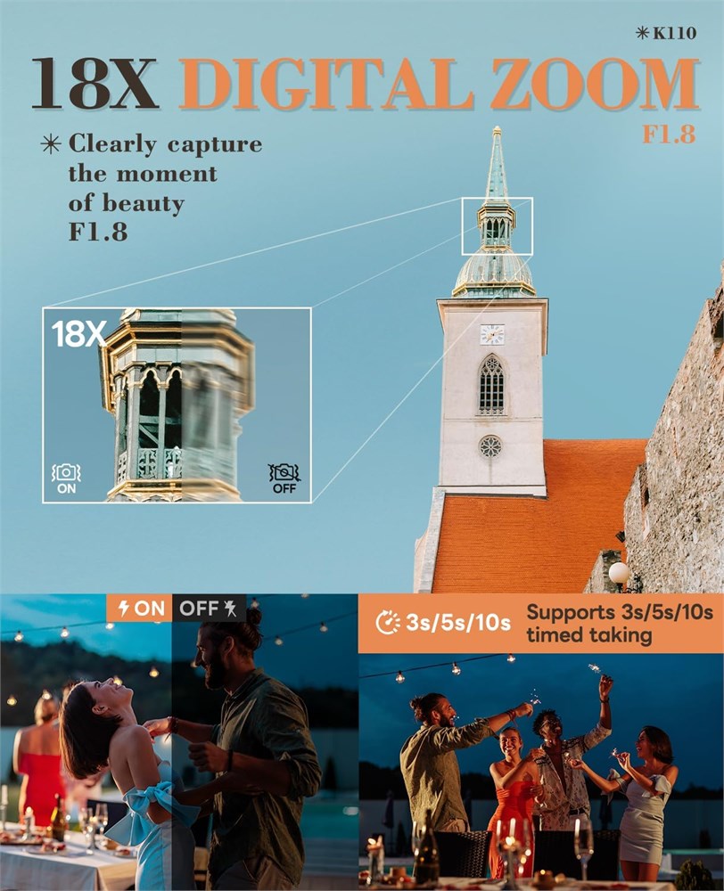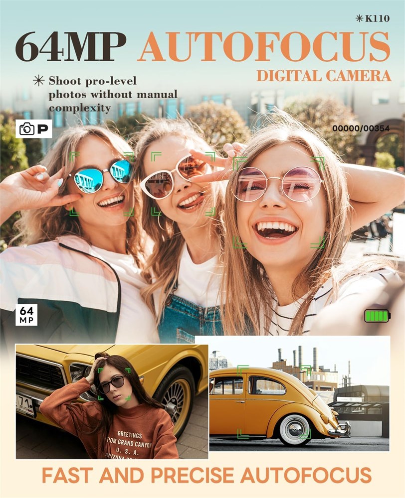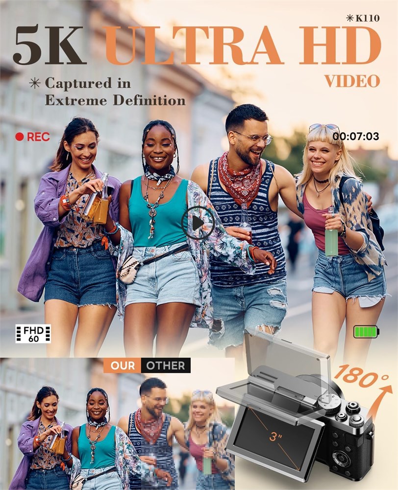 5K Vlogging Camera Shoot stunning 5K videos and capture ultra-high-res 64MP photography with edge-to-edge clarity. Get dramatically closer to the action with powerful 18X digital zoom for crisp, detailed close-ups of distant subjects. NBD cameras for photography factory-tuned settings ensure perfect exposure and focus just point, click, and capture professional-quality content effortlessly, even for beginners. 64MP Cameras for Photography Designed for travelers, this camera combines 5K video and 64MP photography in a compact setup. The 180 flip screen is a game-changer for solo vloggers, while intuitive one-button operation keeps things stress-free when you re exploring. With built-in filters to match any mood from vibrant landscapes to warm street scenes you ll have everything you need to tell your travel story beautifully. Professional Camera & User-friendly : For photography lovers your perfect blend of pro power and ease! The 4.7mm F/1.8 lens delivers sharp details, beautiful bokeh, and pro-level image quality, matching bulkier high-end gear. Fast, precise auto-focus performs brilliantly even in low light. Designed for all, it s ultra-user-friendly beginners can point and shoot to capture life s highlights hassle-free. Versatile Modes & Physical Dial : Unleash creativity with all-around modes crisp photos, smooth videos, slow motion, stunning time-lapses, and artistic filters, all in one camera. The intuitive physical dial switches functions in a split second, no menu fumbling. Ideal for quick snaps and planned shoots alike, it pairs versatility with pro-grade efficiency. Best Gift & Abundant Freebies The package contains a 5K & 64MP camera, 2 batteries, charger, 64GB SD card set & USB cable. Loaded with accessories, no need for extra buys. With sleek design and top-notch features, this camera is a knockout gift for photo enthusiasts, any time.