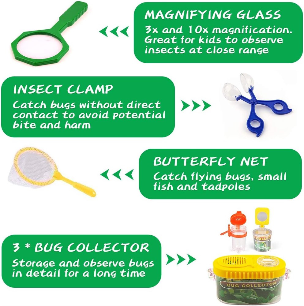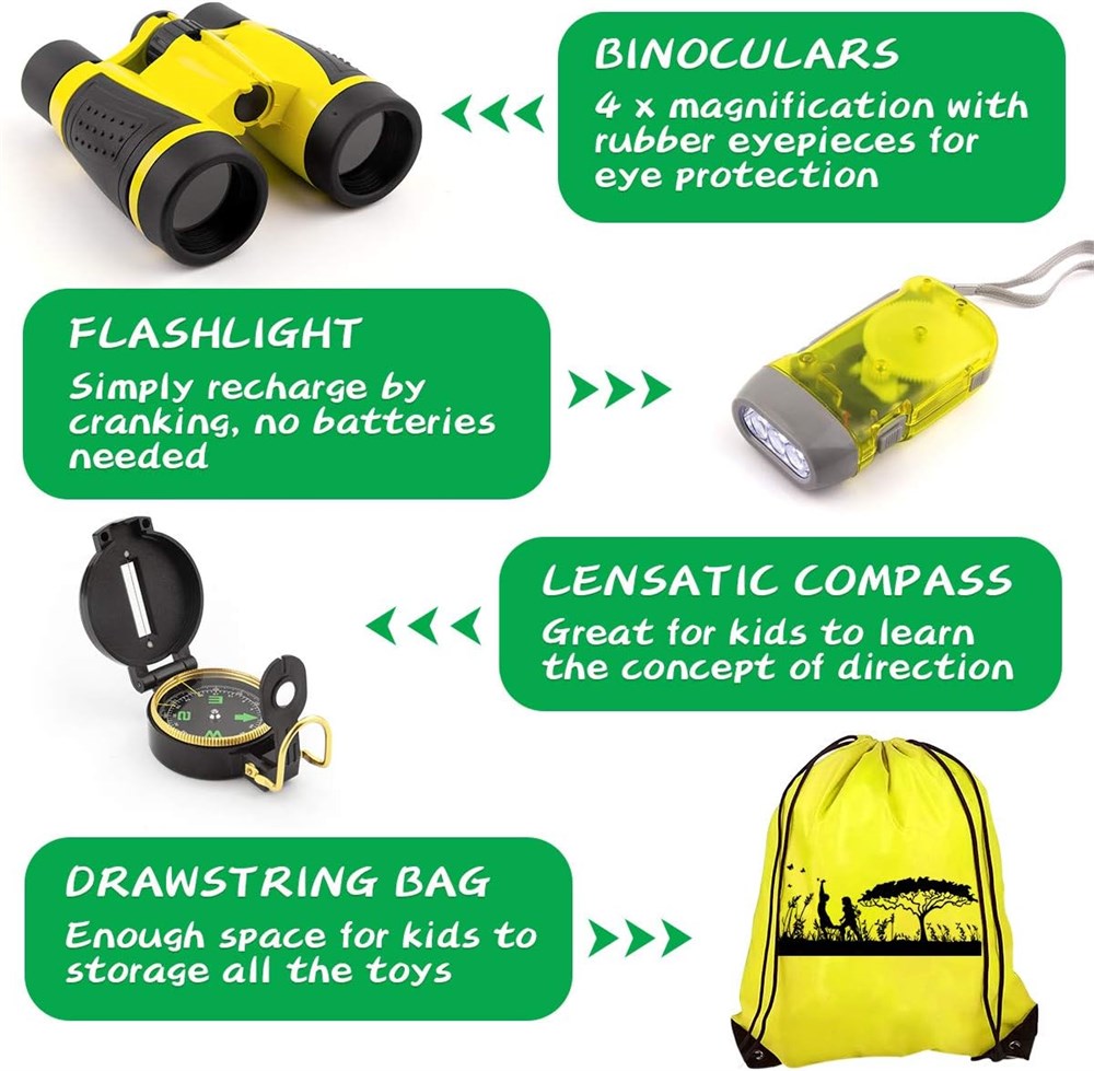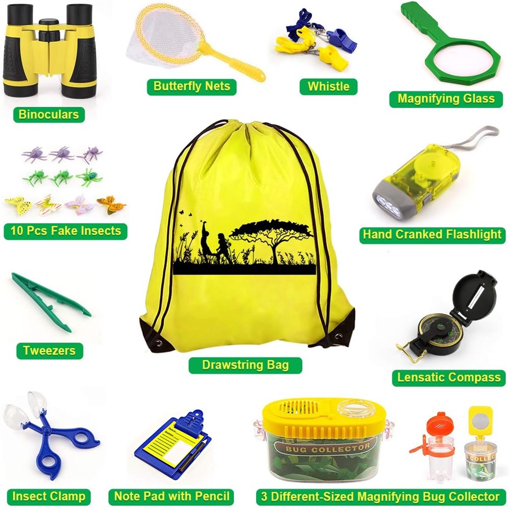 Kit d'exploration de 24 pi ces Le kit d aventure pour enfants Kaqinu offre 24 pi ces d accessoires d explorateur n cessaires, y compris des jumelles, boussole, sifflet, lampe de poche, loupe, filet de papillon, pince piler, pince insectes, collecteur d insectes, faux insectes, bloc-notes et sac cordon pour un transport facile l ext rieur et le rangement. Apprendre propos des insectes et des insectes : grossissement x 4 pour examiner les plantes, les insectes et les rochers. Merveilleusement amusant pour le camping et les recherches en int rieur ou en ext rieur. Utilisez la pince insectes et le filet papillon pour attraper les insectes qui vous int ressent. Les enfants n'ont pas besoin de toucher les insectes. Et les collecteurs d insectes peuvent vous accompagner plus longtemps. Explorez le monde entourant : ce pack d'aventure contient tout ce dont les jeunes explorateurs ont besoin. Jumelles de haute qualit pour aider les enfants d tecter l'environnement environnant. La boussole lensatique apprend aux enfants trouver la bonne direction et localiser les positions sur les cartes ou sur le terrain. Une lampe torche manivelle lumineuse qui prolonge facilement le bonheur de l'enfant jusqu' la soir e. Chaque sifflet est livr avec un cordon, vos enfants peuvent facilement accrocher sur leur cou. Soyez intime avec la nature - Fini les jeux TV et vid os. Laissez vos enfants tenir loign s des appareils lectroniques et les motiver sortir, jouer avec cet ensemble d'exploration de la nature, aider les enfants explorer l'environnement naturel et d couvrir leur environnement r el. Meilleur cadeau ducatif pour les enfants Si vous tes la recherche d'un cadeau parfait qui favorise l'apprentissage de la tige, encourage vos enfants explorer le plein air et d velopper des comp tences de vie r elles, stimule le d sir naturel d' tre un avec la nature, cet ensemble est fait pour vous. C'est galement un excellent cadeau pour les anniversaires, les vacances et toute autre occasion. Nous recommandons fortement pour les enfants g s de 3 12 ans.