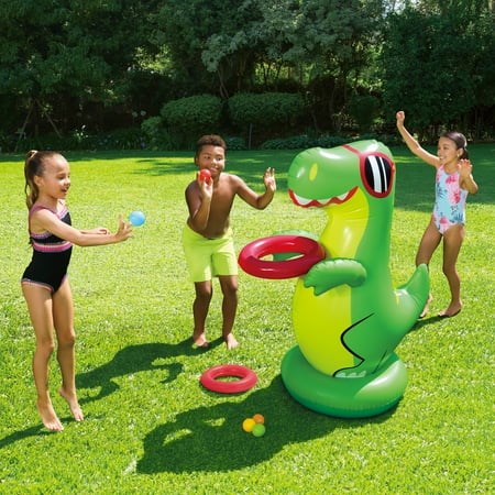Inflatable jumbo ring toss game for pools, beaches and lakes Fun dinosaur design Versatile, Use it as photo prop and outdoor game Durable, puncture-resistant materials Includes 5 PVC balls and 1 inflatable ring Repair patch included Approximate deflated size: 53" x 37" (1.35 m x 94 cm) Approximate inflated size: 39.5" x 26" x 49" (1 m x 66 cm x 1.24 m) Age: 3+