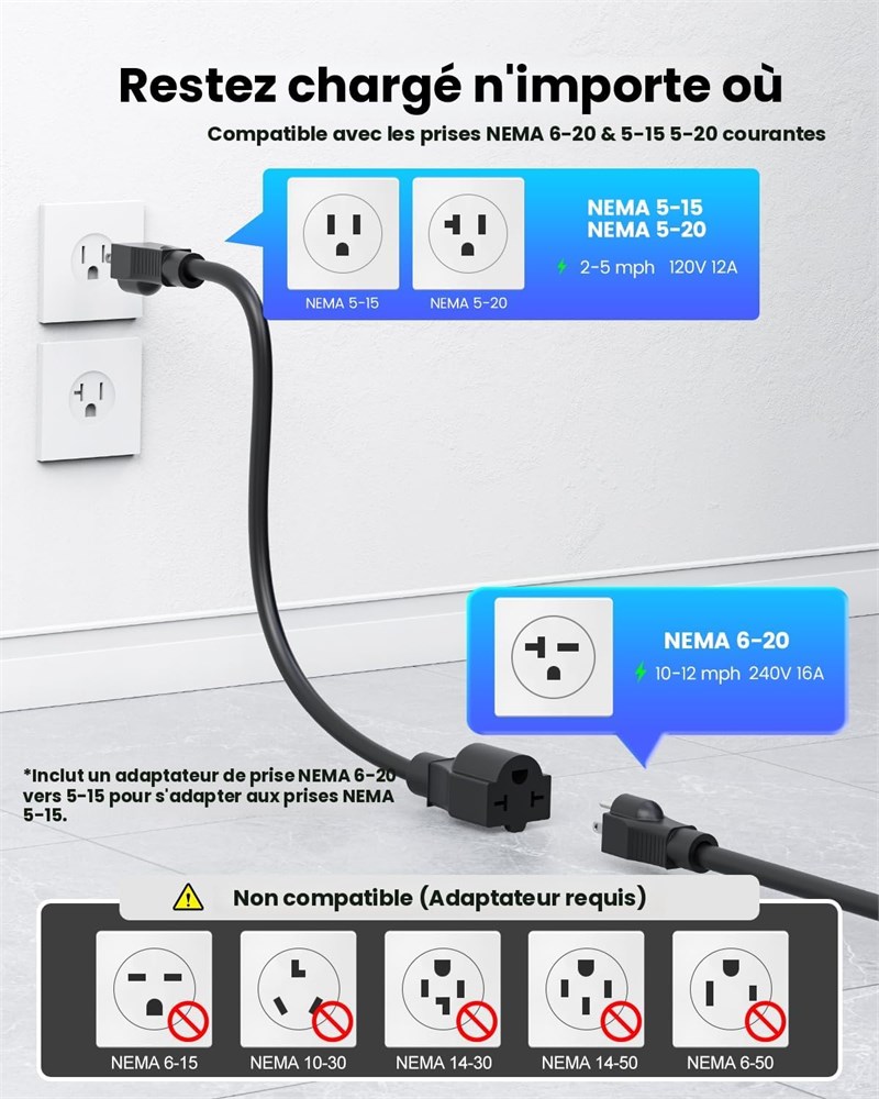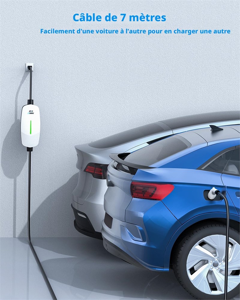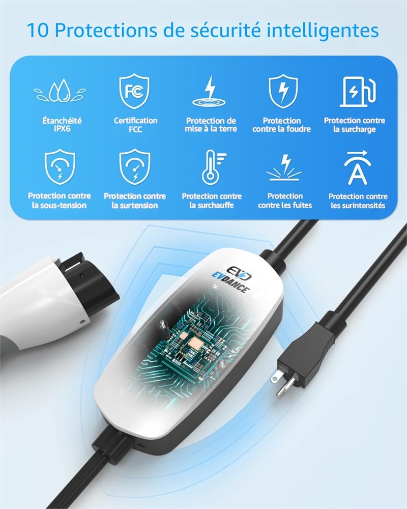 Performance sup rieure : le chargeur EVDANCE 16 Amp Niveau 1 et Niveau 2 est compatible avec les v hicules lectriques J1772 et les v hicules hybrides rechargeables (norme nord-am ricaine). Il est 4 fois plus rapide que les autres chargeurs L1 8A. *Tesla n cessite un adaptateur SAE J1772. Affichage d'indication : affichage DEL qui peut vous indiquer l' tat et les erreurs lors de la recharge de votre v hicule lectrique. Durable et s curitaire : ce chargeur de voiture lectrique est fabriqu partir de mat riaux robustes de haute qualit et est certifi FCC et CE. La conception de la puce intelligente de son bo tier de contr le permet de surveiller l' tat de la charge tout moment. Le niveau de protection du bo tier est IP66 et l'indice de r sistance au feu est UL94V-0. Pratique utiliser : ce chargeur portatif est dot de prises NEMA 6-20 (220 V ou 240 V) et NEMA 5-15 (110 V), et le sac inclus facilite son transport en d placement. La longueur du c ble est de 7 m, ce qui vous permet de l'utiliser de mani re flexible depuis n'importe quel endroit du garage ou de l'all e.