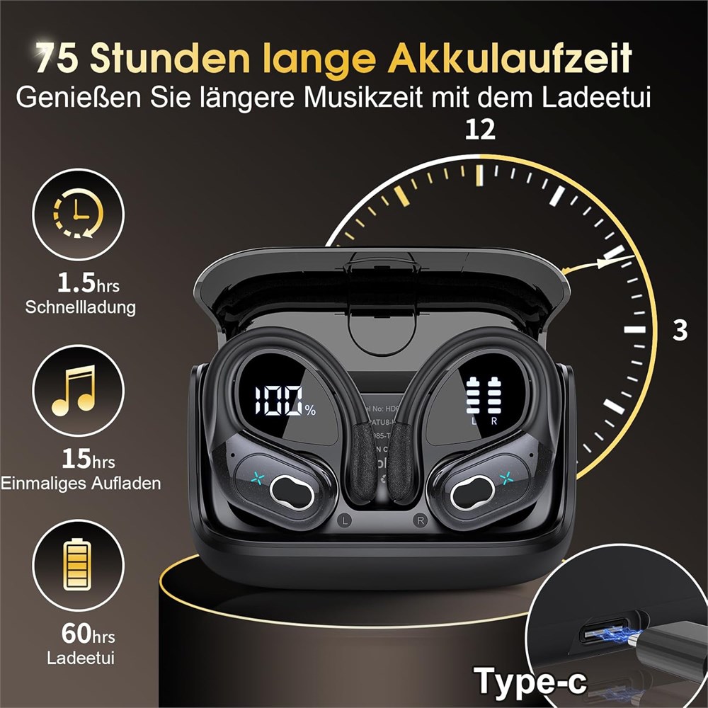 Latest Bluetooth 5.4 Technology and Auto Pairing: These bluetooth earphones are designed with the latest Bluetooth 5.4 technology, which provides stronger connection stability and longer range of bluetooth, offering a remarkable 75% increase in data transfer speed for high-quality sound with ultra-low latency. The moment you open the case, the earbuds instantly and effortlessly pair with your previously connected device, sparing you from the hassle of manual pairing and long connection times. Dual LED Display and 75 Hours of Playtime: These headphones bluetooth wireless are equipped with a dual LED display that accurately shows the remaining battery life in a digital format. Thanks to USB-C fast charging technology, they offer quicker and more stable charging. The running earbuds deliver up to 15 hours of premium sound on a single charge, while the charging case provides four additional full charges, giving the over ear headphones wireless a total playtime of 75 hours. Superior Comfort and IPX7 Waterproof: These ear buds wireless bluetooth come with three different sizes of ear tips (S/M/L). The ear buds with ear hooks feature an innovative soft ear hook design that fits comfortably around the contours of your ears, allowing for extended wear without discomfort. With an IPX7 water-resistant rating, the bluetooth wireless headphone are well-protected against light rain or sweat, making them perfect for running, workouts, gym sessions, and travel. Premium Sound and ENC Noise Cancellation: These wireless ear buds feature advanced 13mm drivers and a triple-layer composite diaphragm. Every part of the driver works together to create a balanced sound profile, delivering rich bass, clear mids, and sharp highs. The earbuds wirelesss also come equipped with a high-quality ENC microphone, using noise-canceling and lossless HD rendering technology to effectively block out background noise for clearer conversations and better sound clarity. Unique Button Design and Wide Compatibility: These earhook earbuds feature physical buttons, eliminating the need to search for different controls. With just one press, you can easily turn them on/off, play/pause music, skip tracks, answer/end calls, adjust the volume, and access other functions. The bluetooth earbuds noise cancelling are compatible with most Bluetooth-enabled music players, including both iOS and Android devices.