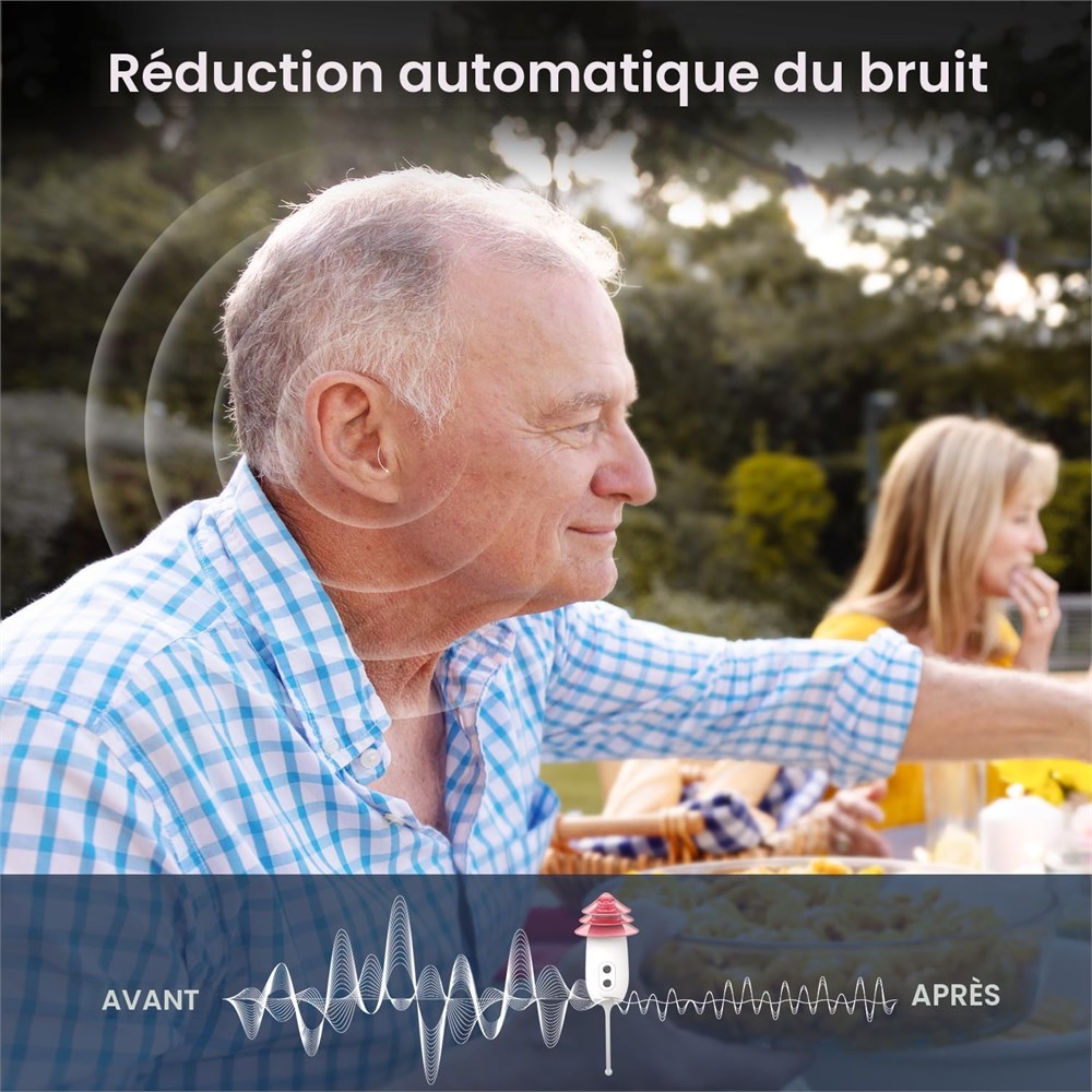 V ritables aides auditives, pas amplificateurs : les aides auditives invisibles dans le canal (IIC) pour les personnes g es ayant une perte auditive l g re mod r e, le bruit est automatiquement r duit pour une clart constante et une qualit sonore stable, vous permettant de vous concentrer sur les conversations et les sons importants sans distractions inutiles. Concentrez-vous uniquement sur le son original : Audio fid le la vie, red fini . Aliment e par une puce avanc e 16 canaux, notre technologie s'adapte aux sons doux et forts en temps r el, pr servant les d tails nets et une acoustique quilibr e. Red couvrez le son dans sa forme la plus pure. Indice d' tanch it IP66 : protection IP66 contre la poussi re et l'eau con ue pour les modes de vie actifs. R siste aux fortes pluies, la sueur et aux jets d'eau directs - continuez profiter des randonn es, des entra nements et des jours de pluie sans soucis d'aide auditive. 78 heures d'autonomie efficace : 13 heures d'utilisation quotidienne vous permet de rester connect des trajets au lever du soleil aux r unions tardives. L' tui compact ajoute 65 heures suppl mentaires, parfait pour les voyages du week-end ou pour oublier votre chargeur la maison. Fonctionnement respectueux des personnes g es, contr le par application : contr le sans robinet pour une audition stable. R glez les param tres mains libres via notre application adapt e aux personnes g es avec de grands boutons et des commandes vocales - pas besoin de trembler les doigts. coutez clairement les moments de la vie, des rires des petits-enfants aux conversations de d ner.