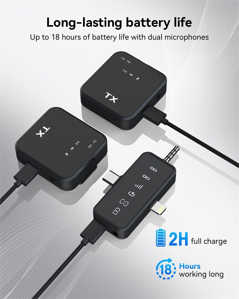 Crystal-Clear Audio: The wireless microphone delivers high-quality audio, easily create on-the-go content with PQRQP's noise-cancelling technology. Record confidently with natural, low, or high settings and a windproof cotton cover. In addition, this wireless microphones is suitable for karaoke, say goodbye to bulky microphone, sing when you want to sing, Karaoke is more free! Full Compatibility: PQRQP upgraded lavalier microphone comes with a 3 in 1 universal receiver, eliminating the need to replace multiple individual interfaces or interface cables. Compatible with android smartphones, iphone(including iPhone 15), iPad, laptops, personal computers, camera etc. Mini microphone is suitable for blogging, interviewing, live streaming, blogging, podcasting, youtube, instagram, TikTok. Up to 18 Hours of Operation Say goodbye to battery anxiety. Whether you're livestreaming or making videos in remote locations with fewer charging options, this Bluetooth microphone has got your back. Mini microphone keeps up with 9 hours on a single charge or 18 hrs with 2 mics in total. 328 Ft Transmission: This wireless lavalier microphone uses state-of-the-art 2.4G technology to provide a stable connection, so you can achieve up to 328 feet of wireless transmission and ultra-low-latency recording of an ultra-wide range of footage that less lip-syncing in post. Reverb/Mute Function: The reverb function provides 3D sound and an immersive feeling. The mute function allows for temporary mute during team communication, device setup, and other unexpected situations without shutting down the system.