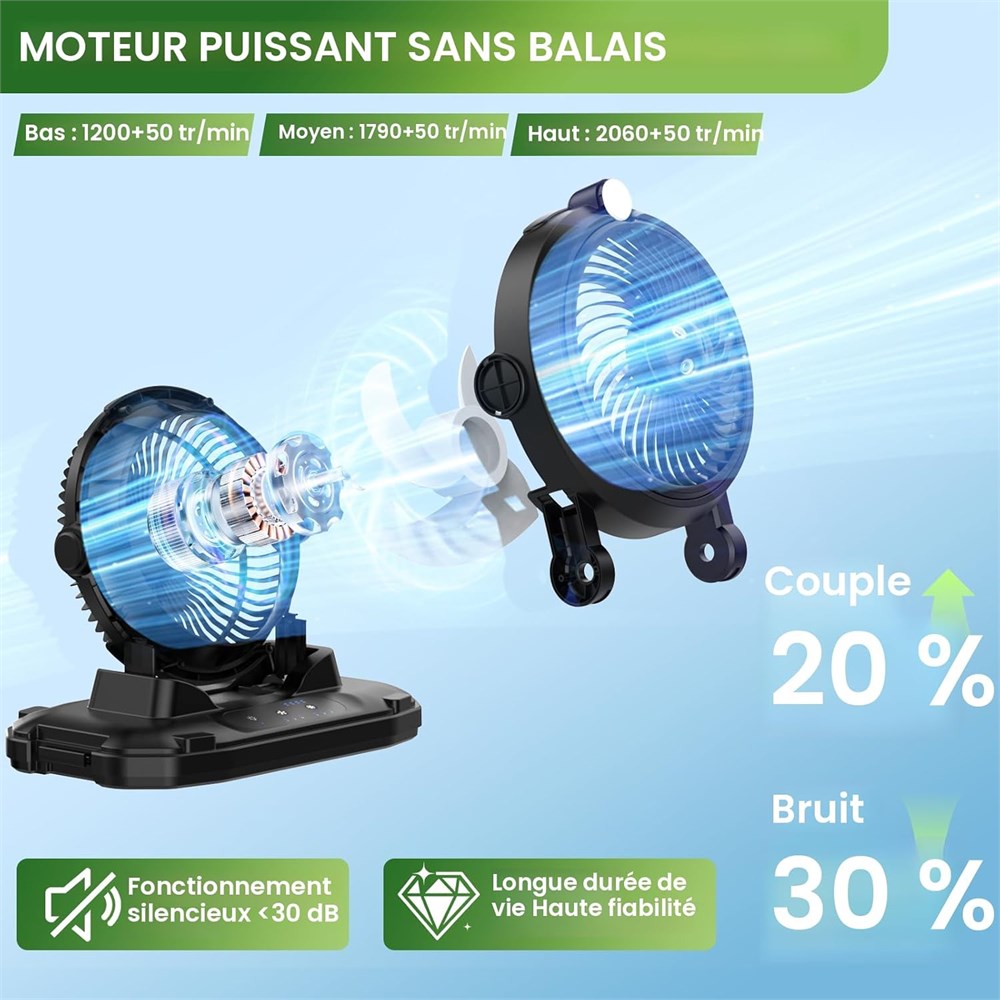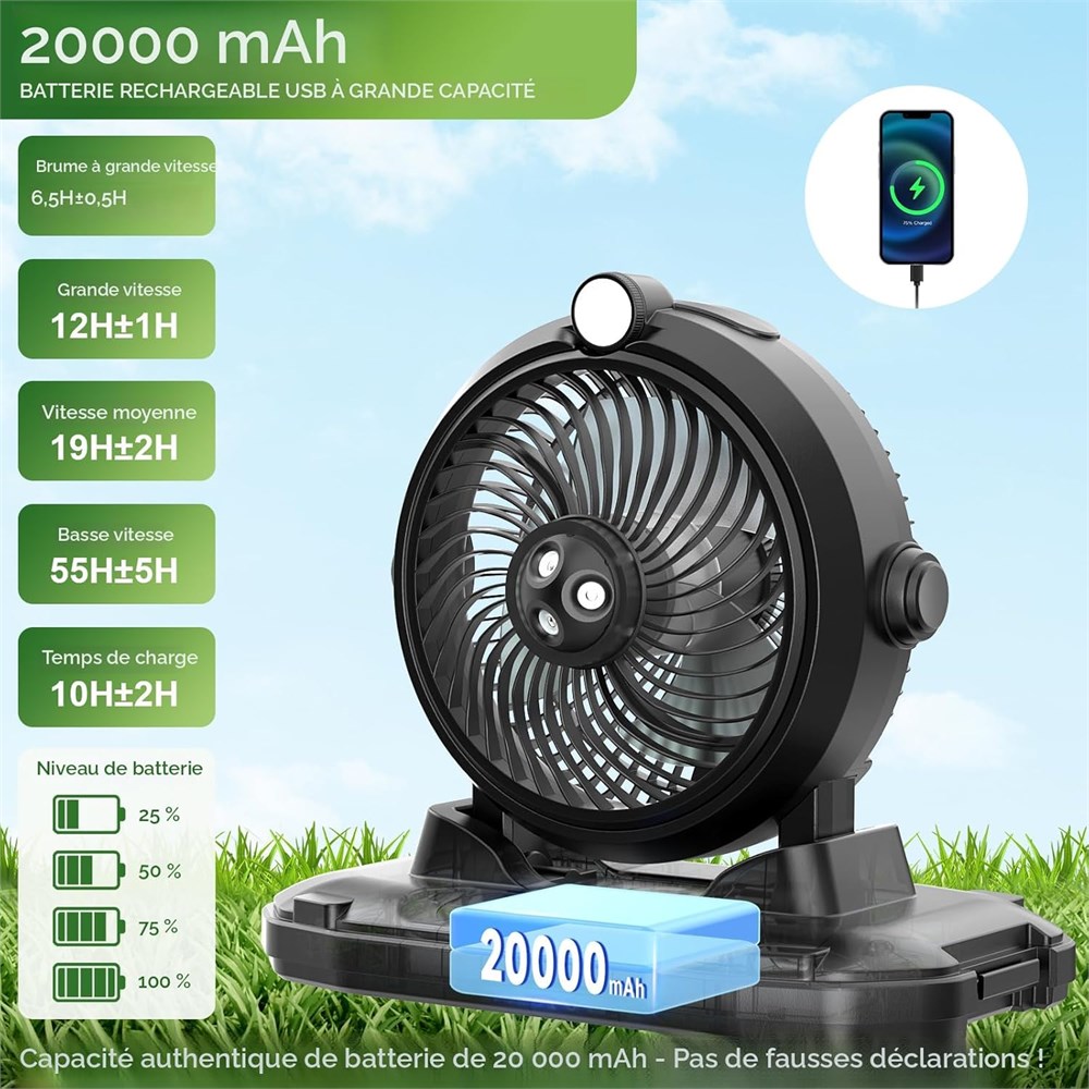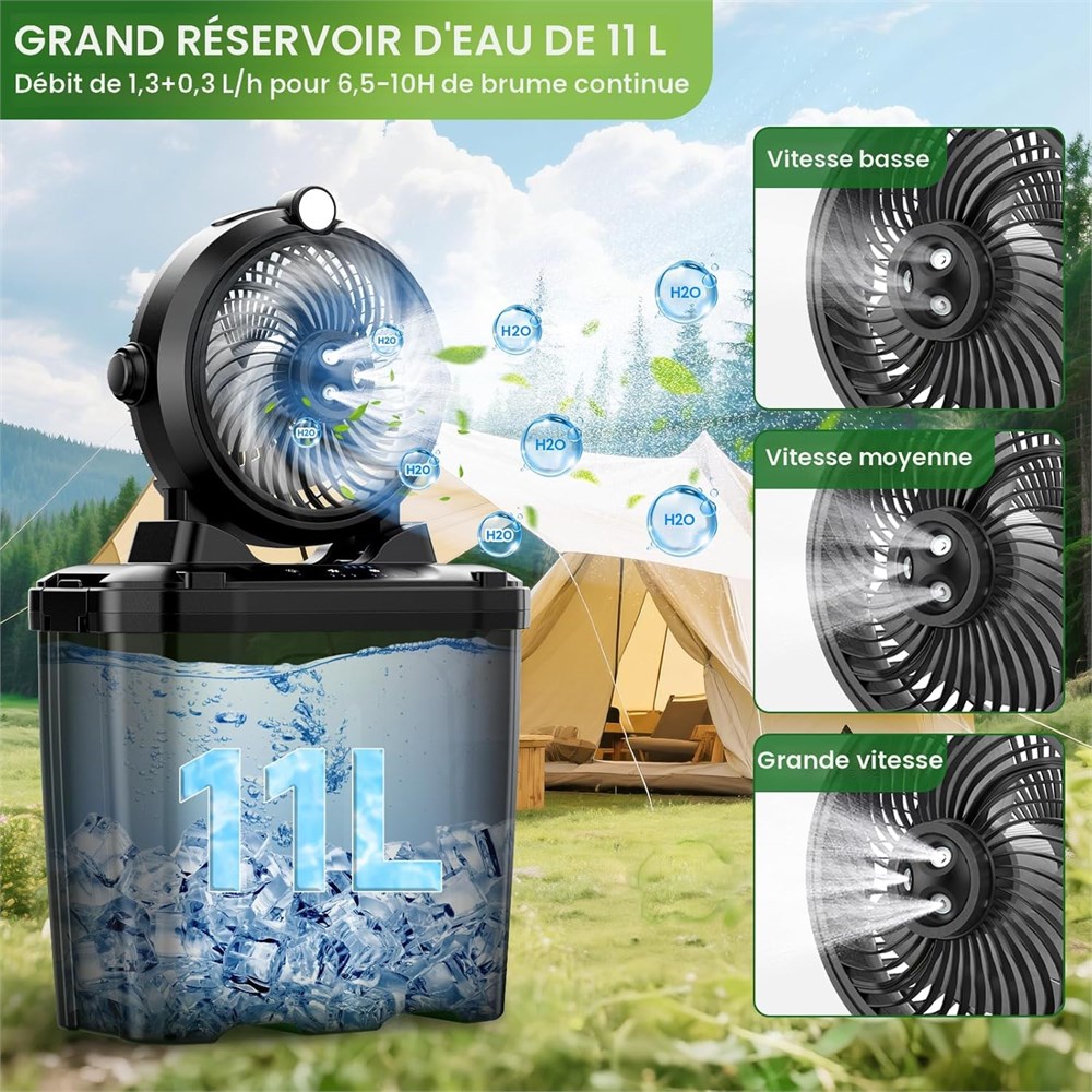 Brume confortable : le ventilateur brumisateur portable offre une exp rience ultra-rafra chissante. Sa fine brume s' vapore instantan ment, refroidit efficacement votre peau et abaisse la temp rature de l'air ambiant. Lot de 2 Lot de 2 Seau de grande capacit de 11 L : notre ventilateur brumisateur portable dispose d'un seau d'eau ultra large de 11 L, offrant 8 10 heures de refroidissement continu avec un seul remplissage. Lorsqu'il n'est pas utilis , le ventilateur se replie pour un rangement compact, ce qui le rend facile transporter et ranger. Grande batterie de 20 000 mAh : aliment par une batterie haute performance de 20 000 mAh, ce ventilateur brumisateur aliment par batterie offre 6 7 heures de fonctionnement avec brume et ventilateur (haute vitesse) ou 12 55 heures avec ventilateur uniquement, parfait pour les longs voyages en plein air. La fonction de brumisation s'arr te automatiquement apr s 4 heures pour prot ger le moteur et peut tre red marr e si n cessaire. 3 vitesses r glables Profitez d'un confort personnalisable avec 3 r glages de vitesse (faible, moyenne, lev e). quip d'un moteur brushless import d'Allemagne et de pales a rodynamiques haut de gamme, ce ventilateur de refroidissement fonctionne silencieusement (< 30 dB) et assure des performances durables. Design multifonction : polyvalent et portable, ce ventilateur brumisateur d'ext rieur prend en charge les modes au sol, sur bureau et suspendu. Avec fonction d' clairage LED, c'est un compagnon id al pour les voyages en plein air. Fabriqu en mat riaux PC et PP haute performance, le produit est durable, r sistant la chaleur, non toxique et respectueux de l'environnement. Remarque : la fonction d'atomisation ne peut pas tre utilis e lors de l'accrochage. Cadeau d' t Emball dans une l gante bo te en papier, ce ventilateur brumisateur de camping se transforme en un cadeau d' t attentionn avec une touche d'emballage cadeau. Parfait pour la famille, les amis ou les partenaires qui aiment les activit s de plein air comme le camping, les pique-niques et les voyages. Conseils : pour garantir une performance optimale du ventilateur de brume : utilisez de l'eau propre, assurez-vous que le tube est enti rement immerg dans l'eau. Essuyez r guli rement la buse avec un coton-tige pour viter l'encrassement. Une petite quantit de gouttelettes d'eau dans le r servoir est normale en raison des tests avant exp dition. Redressez doucement le tube s'il est pli ou nou , attendez un certain temps pour reprendre son fonctionnement normal.