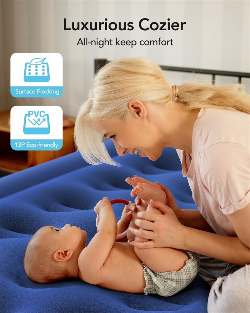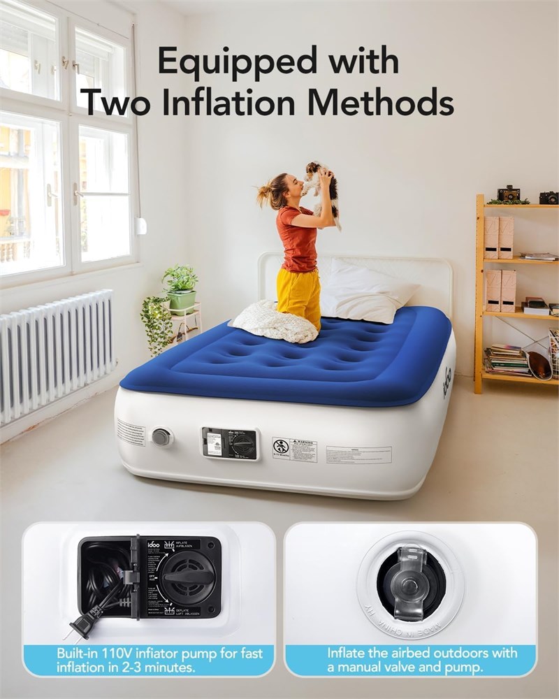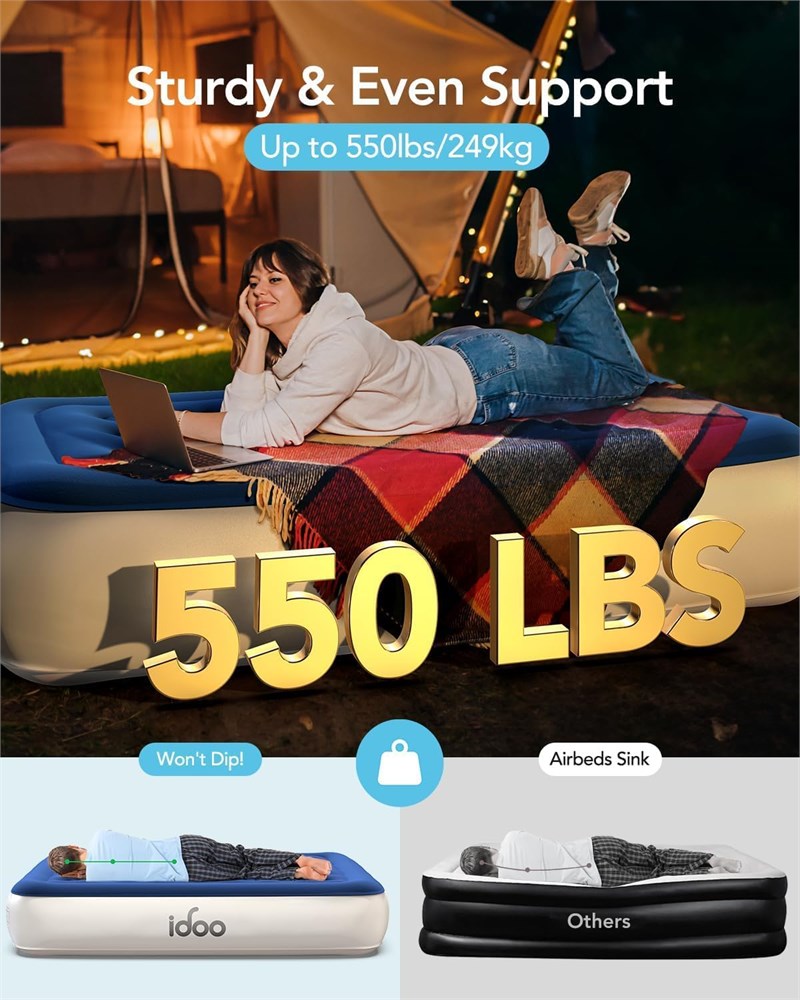 Fast Inflation/Deflation: The iDOO inflatable mattress offers rapid inflation and deflation, achieving full readiness in just 3 minutes for time-saving convenience and increased efficiency. Comfortable and waterproof surface: The iDOO air mattress twin has a soft, waterproof top that's comfortable like goose down and easy to clean. Stable and durable structure: Engineered for resilience, the iDOO air mattress features 21 integrated coils that ensure an even weight distribution, capably supporting up to 650 pounds while preserving its form for consistent comfort and unwavering support. Anti-slip and anti-noise: The iDOO single air mattress is 75x39x13 inches, made with tough waterproof material to avoid damage, and has a non-slip bottom to stay in place and keep quiet for a peaceful sleep. Easy to carry and store: The iDOO blow up mattress comes with an included storage bag, which can be easily stored and carried at any time, perfect for camping trips or entertaining guests. Helpful Note: The mattress may initially seem to lose pressure as the material stretches, which isn't a leak. Simply re-inflate it.