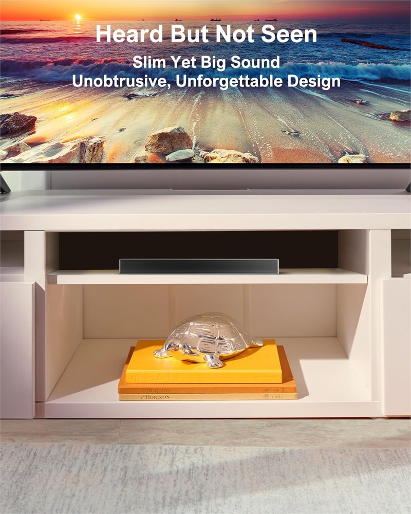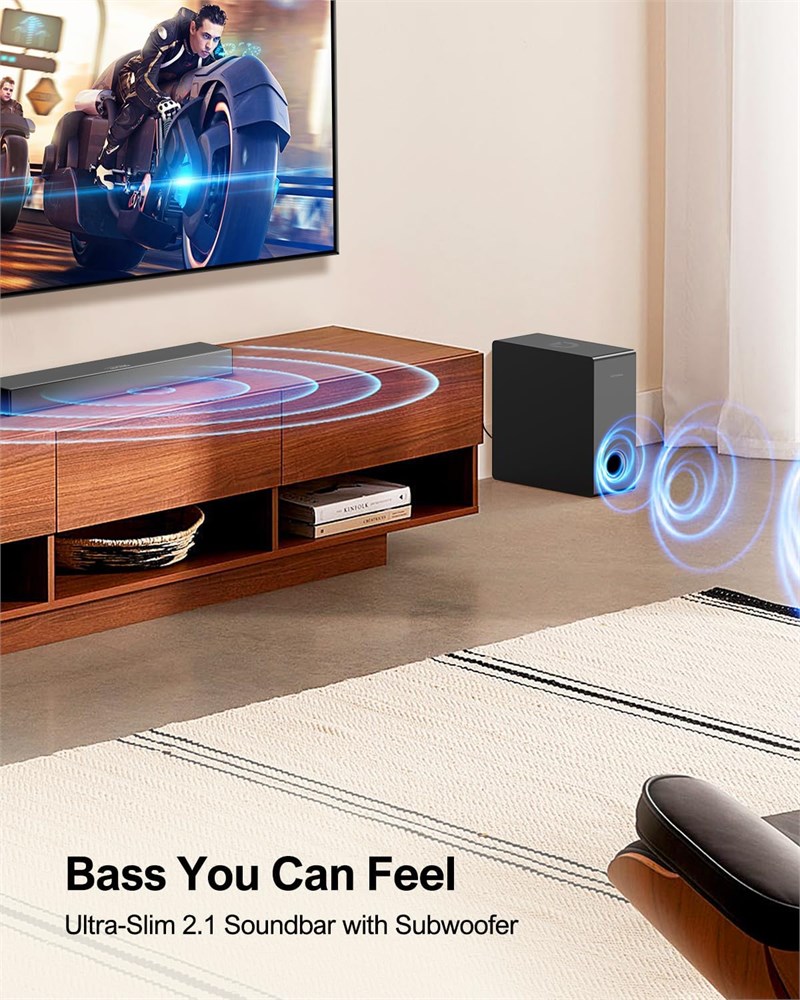 HEARD BUT NOT SEEN: Just 1.5-inch tall, this sleek and unobstructive soundbar for tv is easy to hide, until you hear the crisp and clear sound from soundbar. Built-in 2 x 2.25" racetrack drivers to take up less space yet louder sound WIRED SUBWOOFER WITH ENHANCED BASS: The 7.2L large-volume subwoofer enables the diaphragm's amplitude to reach 15mm, achieving a more powerful bass. ULTIMEA exclusive BassMAX technology enriches the low frequencies, enabling adjustable bass for a richer, deeper sound experience PREMIUM GAMING MODE: Sleek and slim pc soundbar perfectly fits the size of your PC, visually and audibly elevating your gaming environment. The enhanced "Game" mode and subwoofer put you in the center of the game CUSTOMIZED 3 EQ MODES: Thoughtfully designed to spark your imagination in every scene. Shocking sound effects in "Movie" mode, delicate sound quality in "Music" mode, always being a winner in "Game" mode. Perfect for any space, effortlessly unlock diverse sound experiences WIDE COMPATIBILITY: The sound bar supports ARC, Optical, AUX, USB and Bluetooth 5.3 connection, it effortlessly integrates with a wide range of devices, is your one-stop audio entertainment system for TVs, computers, phones, projectors, and gaming consoles. What's more, we provide all the necessary cables for a hassle-free setup ULTIMEA Customized Sound EQ Programs: At ULTIMEA, we highly value individual sound preferences and offer a diverse range of personalized EQ programs to cater to your unique requirements. If you find the need, please reach out to us for balanced bass, enhanced bass levels, treble adjustments, improved sound quality, clearer vocals, EQ fine-tuning, volume reduction and more ULTIMEA Ultra-Slim Soundbar Series: The dimensions of the soundbar are 15.7" L x 3.1" W x 1.5" H. This stylish, unobtrusive TV soundbar is only 1.5 inches high, easily concealing beneath your TV to minimize space usage. The 5.25-inch subwoofer utilizes BassMax technology, it deepens the low-frequency response, widens the soundstage, and delivers a more powerful bass effect.