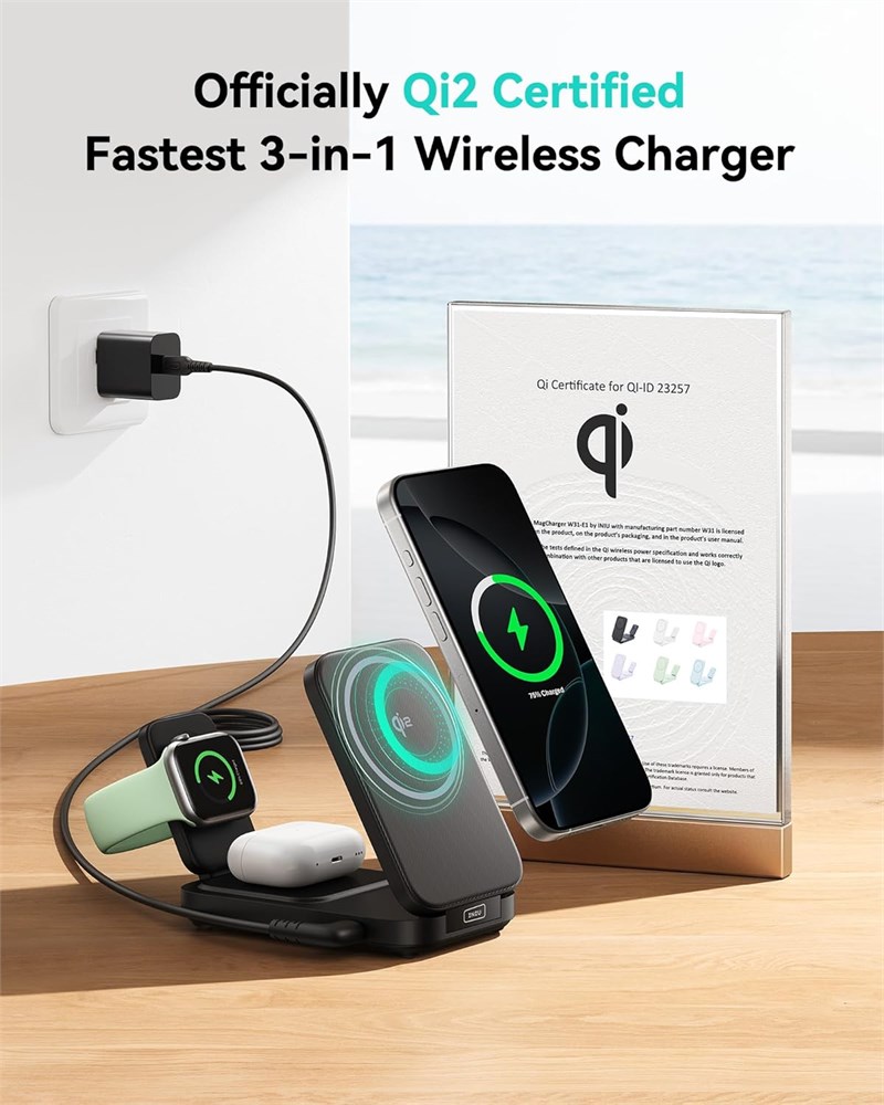 From INIU the SAFE Fast Charge Pro: Experience the safest charging with over 38 million global users. At INIU, we use only the highest-grade materials. Ultra-Compact & Portable: 18% Smaller than a standard mouse at just 3.9*2.4*0.8in, this 3-in-1 foldable wireless charger fits effortlessly into your pockets or bags for true on-the-go charging convenience. Fastest Charging Redefined: This portable wireless charger offers Qi2-certified 15W compatible wireless charging for iPhone 12- 16 series. It also ensures up to 5W fast charging for iwatch, capable of charging an iwatch S10 to 63% in just 30 minutes. Clutter-Free 3-in-1 Charging: The 3-in-1 charger keeps your iPhone, iwatch, and AirPods fully charged and organized simultaneously no more bulky adapters or messy cords. What You Get: INIU 3-in-1 wireless charger*1, 30W Adapter*1, 4.9ft USB-C to USB-C cable, user manual*1.