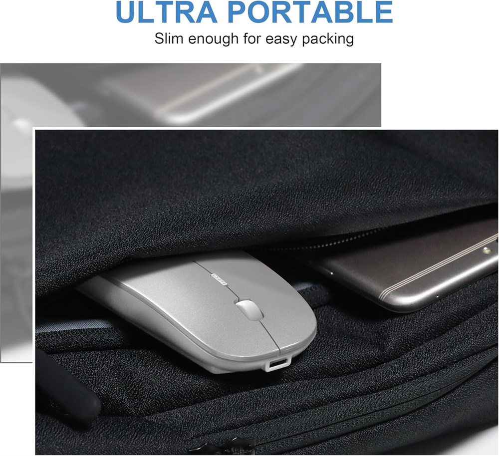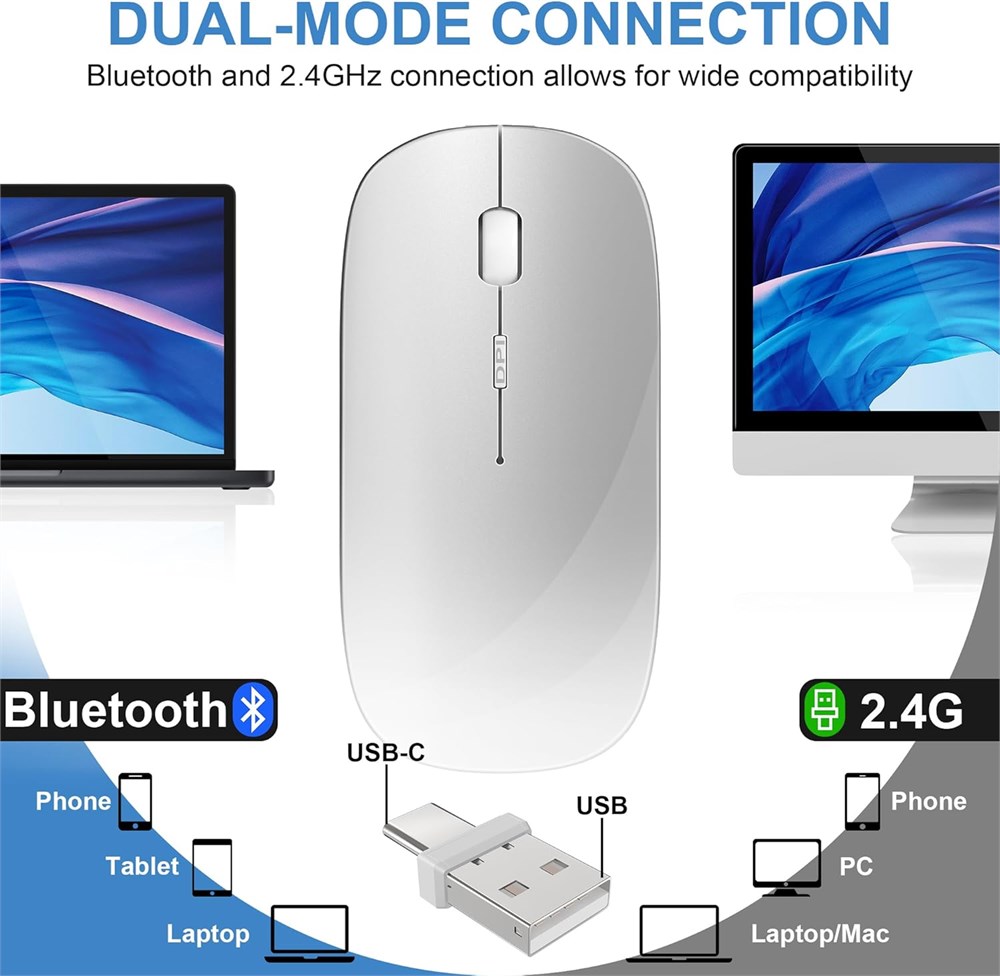 Souris en mode Daul : cette souris sans fil Bluetooth ne n cessite aucun logiciel d'installation. Elle peut tre utilis e comme souris Bluetooth ou comme souris sans fil 2,4 G en connectant le r cepteur USB (USB-C) au port USB (USB-C). Clic silencieux : cette souris d'ordinateur r duit le bruit de 85 %, ce qui peut viter les bruits aigus. Vous n'avez pas vous soucier de d ranger les autres c t de vous, et elle peut galement vous aider vous concentrer sur votre travail ou vos tudes. Le bouton de r glage DPI bascule entre 3 niveaux (800, 1200, 1600), de sorte que vous pouvez facilement changer la vitesse de la souris pour r pondre vos besoins quotidiens de travail. Plug & Play : il suffit de brancher le r cepteur USB dans l'ordinateur, et vous pouvez commencer utiliser la souris. La souris silencieuse rechargeable sans fil 2,4 G offre une connectivit rapide, puissante et fiable avec une port e efficace allant jusqu' 10 m tres. Design rechargeable : la souris dispose d'une batterie lithium-ion int gr e durable, il n'y a donc pas besoin de remplacer la batterie, et elle peut tre facilement charg e l'aide du c ble USB inclus. Avec seulement 2 3 heures de charge, vous pouvez l'utiliser pendant 30 45 jours, ce qui la rend id ale pour de longues p riodes d'utilisation. Vous pouvez galement d finir les modes de veille automatique et de r veil automatique pour conomiser de l' nergie et vous r veiller en cliquant sur n'importe quel bouton de souris.