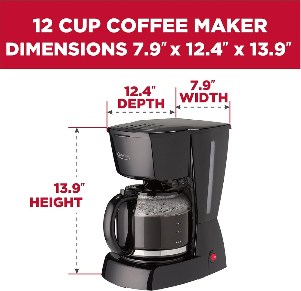 UP TO 12 CUPS OF COFFEE: The included heat resistant glass carafe holds, pours and serves up to 12 cups of coffee. Perfect for large families or family gatherings and serving guests. PAUSE & POUR: Betty Crocker coffee machine has a pause & pour feature for those who can't wait for that first cup. Simply pause the machine and starts it up again to resume coffee brewing. KEEPING IT WARM: This Betty Crocker kitchen appliance has a non-stick warming plate to keep coffee warm during the day while also providing an easy-to-clean surface. BASKET FILTER INCLUDED: Coffee maker comes with a removable filter holder that fits paper coffee filters (not included) or its included permanent filter. Permanent filter and coffee filter holder are removable for easy cleaning. OVER 100 YEARS OF COOKING: A timeless cultural icon, Betty Crocker is inextricably linked with the notions of helpfulness, trustworthiness, and quality in the mind.