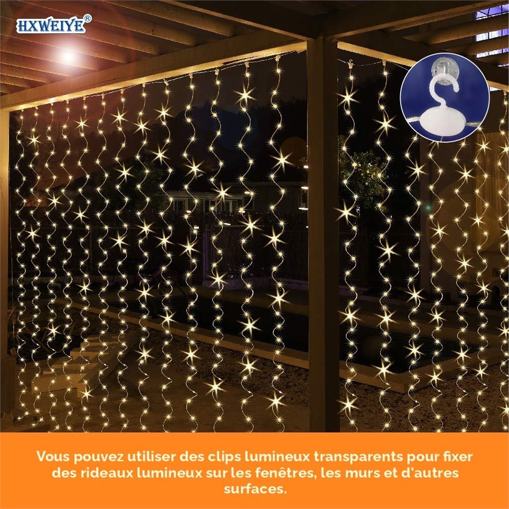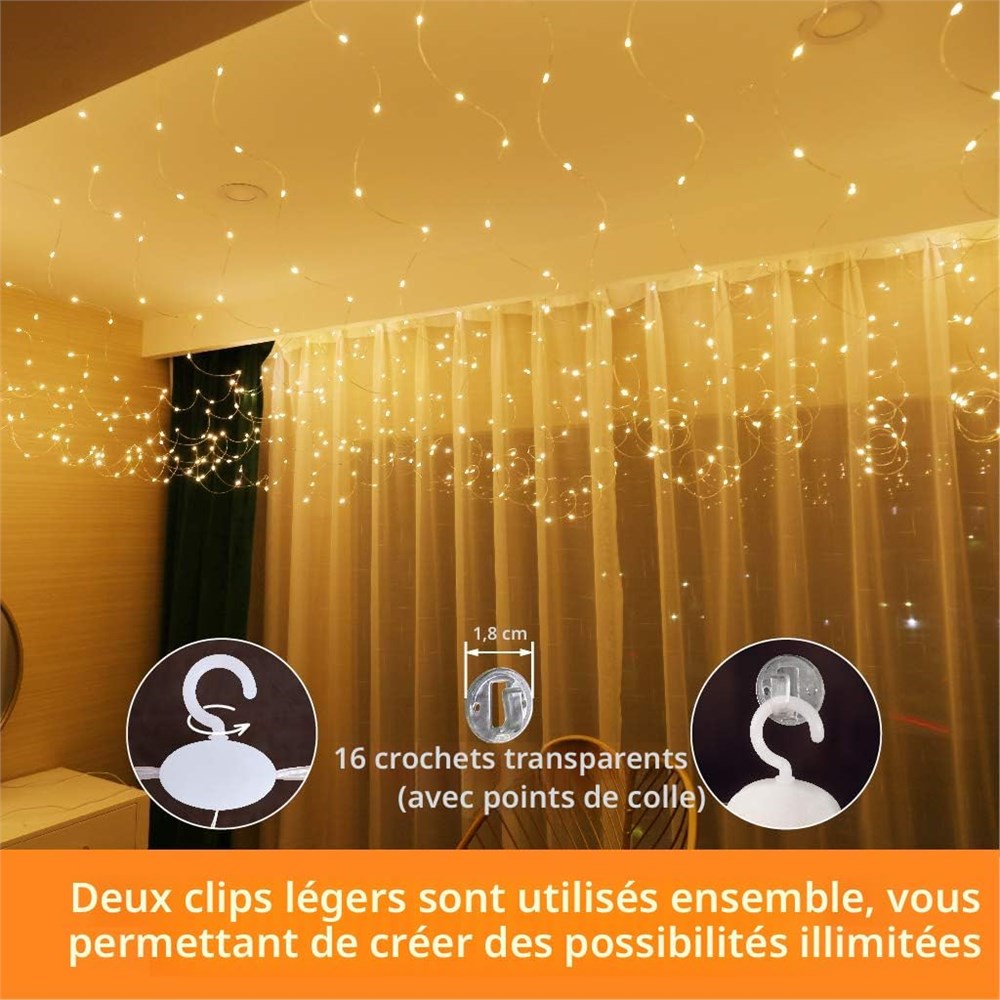 Aliment par USB : branchez avec un chargeur USB, adapt plus d'endroits o vous pouvez tre aliment m me en camping ou barbecue ; ou aliment par une batterie externe, un ordinateur portable, un adaptateur de t l phone portable et plus encore ; commencez et profitez des rideaux lumineux partout o vous le souhaitez Crochets rotatifs 360 : les clips de rotation 360 sur chaque corde sont principalement utilis s pour accrocher les rideaux ; il peut tre accroch n'importe quel angle, comme sur un mur, une fen tre ou une autre surface ; comprend galement 16 ensembles de crochets adh sifs sans dommages ; pas besoin de clous et tient fermement et s'enl ve proprement. Ces deux clips permettent d'accrocher facilement la lumi re du rideau pour certains endroits sp ciaux, non seulement limit e aux fen tres, mais peut galement tre tre accroch sur des murs plats. verre, porches, avant-toits, etc Fil de plomb de 5 m : 300 LED individuelles, rideaux lumineux de 3 x 24 cm livr s avec cordon d'alimentation suppl mentaire de 5 m de long ; fil principal de 3 m et 10 cordes de suspension incluses ; les cordons en fil de cuivre sont solides et flexibles, suspendus et r glables naturellement la hauteur d sir e ; pas de limites votre imagination, faites la forme que vous aimez ; profitez d'un monde de conte de f es (Le rideau n'est pas inclus) S curit : fonctionne avec une basse tension de 5 V, et ne surchauffe pas, aucun risque de provoquer un choc lectrique ou un risque d'incendie ; tr s robuste et super s r au toucher ; la guirlande lumineuse tanche est parfaite pour les d corations int rieures et ext rieures : mariage, toile de fond, f te, maison, fen tre, mur, chambre, etc. Se d roule facilement sans enchev trement 8 modes et minuterie : contrairement d'autres, notre t l commande 17 touches ajoute 4 modes de synchronisation (2/4/6/8 heures allum es, 22/20/18/16 heures teintes) ; 8 modes de flash diff rents au choix, et vous pouvez r gler la luminosit en appuyant sur Dim , + et ; qui sont tous contr l s facilement avec une t l commande sans fil une distance de 10 15 m tres. ers, viser l'USB direction de r ception lorsque vous appuyez sur ; tout est sous votre contr le.