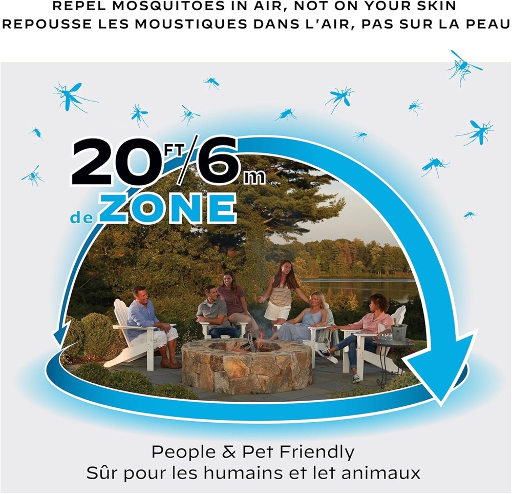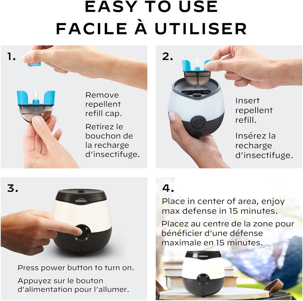 MOSQUITO DEFENSE THAT WORKS: Thermacell effectively keeps mosquitoes up to 20FT/6M away. Works fast, get max defense in 15 minutes. Easy to use. Has dimmable, warm light to cozy up your patio, pool, cottage, and more. Allowed to bring on airplanes. EFFECTIVE 20FT/6M ZONE TECHNOLOGY: Engineered to precisely diffuse repellent, creating a 20-foot/6-meter zone of mosquito defense. Consistent repellent defense won t weaken over time. Rechargeable lithium-ion battery works for 9 hours. REPEL MOSQUITOES IN AIR, NOT ON YOUR SKIN: Repel mosquitoes without DEET sprays or lotions on your skin. Long lasting repellent cartridges are easy to replace. Scent-free, no smoke, no flames. PROPRIETARY FORMULA: Independently tested and reviewed for safety & effectiveness. Repels tough mosquitoes, including those that may transmit Encephalitis and West Nile Virus. People and pet friendly. Always use as directed.
