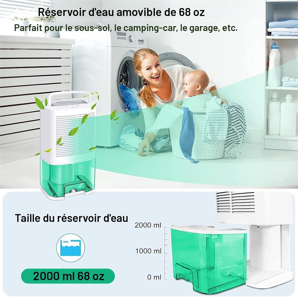 D shumidification puissante : le d shumidificateur haute efficacit pour chambre coucher peut liminer jusqu' 800 ml d'humidit de l'air par jour ( 30 C et 80 % HR), rendant votre maison plus confortable et plus saine. Id al pour les espaces de 9,9 74,3 m , tels que la chambre, la cave, la salle de bain, etc Grand r servoir d'eau : avec un r servoir d'eau de 2000 ml, ce d shumidificateur avec tuyau de vidange peut fonctionner en continu jusqu' 24 heures. Le r servoir d'eau est facile enlever et vider, et la machine s' teint automatiquement lorsque le r servoir est plein Drainage pratique : le d shumidificateur de salle de bain est galement livr avec un tuyau de drainage de 1,5 m, vous permettant de l'utiliser pour un drainage continu dans diff rents sc narios d'utilisation. La machine peut continuer fonctionner m me lorsque le r servoir d'eau est plein Fonctionnement ultra silencieux : fonctionnant moins de 30 dB, ce d shumidificateur pour la maison ne produit pas de bruit fort ou g nant. Le design de l'interrupteur un bouton le rend facile utiliser et parfait pour une utilisation dans votre chambre conomie d' nergie et s curit : le d shumidificateur pour sous-sols est tr s efficace et conome en nergie, ne consomme que 48 W/heure de puissance et seulement 1,1 kW d' lectricit lorsqu'il fonctionne pendant 24 heures. Il dispose galement d'une alimentation interne qui est plus s re utiliser. Dimensions du produit : 20 x 13,5 x 50,7 cm.