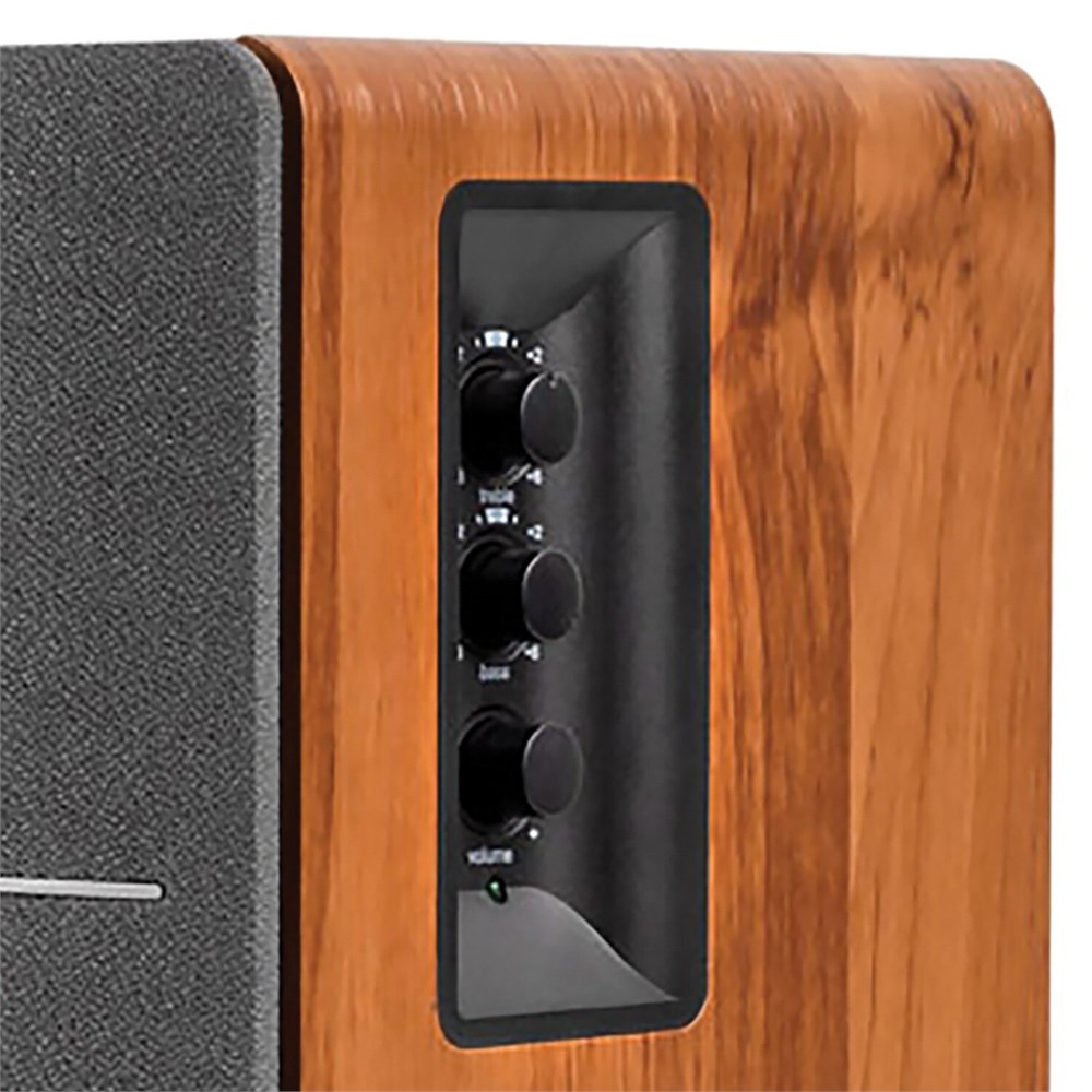 The Edifier R1280T Powered Bookshelf Speakers have combined a retro look with a modern sense of audio quality. Producing a total 42 watts of sound (21 watts RMS each), the R1280T is the ideal well-rounded stereo speaker system as each speaker contains a 4-in. bass driver and 0.5-in. tweeter to offer a sound that is full of presence and depth. You can connect to 2 devices at the same time via its dual RCA inputs no plugging, unplugging, or switching out needed. Designed for enhanced bass, the R1280T bookshelf speaker system is calibrated with a flared bass reflex port, resulting in rich detailed sound. Personalize your listening experience with the bass, treble and volume dials on the active bookshelf speaker. A compact-sized handy remote control is included. You can adjust the volume and set the speakers to mute when needed without having to reach the speakers power and perfection at your fingertips! The wood finish with its rounded corners has a retro appeal, making them the ideal speakers for use with your turntable. The R1280T is also an ideal choice for use with PCs, laptops, tablets, cell phones, etc. Enjoy the advancements in modern day audio with speakers that bring back the warmth of yesteryear. Built-in amplifier (21-watts RMS x 2-speakers) so there is no need for outside amplifier or receiver just plug into source and play. Frequency response 75-Hz to 18-kHz. Dual RCA inputs to avoid tedious plugging and unplugging. Ideal for record players, PCs, laptops, tablets, cell phones, etc. Each speaker has 4-in midrange/bass driver for rich lows and 0.5-in silk diaphragm treble driver for crisp highs. Calibrated, flared bass reflex port enhances overall bass sound. Bass, treble, and volume dials are located on the active speaker with ability to make micro adjustments of treble and bass from -6 dB to +6 dB. Universal power supply accepts 100-volt to 240-volt AC. Includes wireless remote for volume and mute, speaker-connecting cable, RCA to RCA cable, 3.5 mm to dual RCA audio cable, and user manual. Color/Finish Family: Black. Manufacturer Color/Finish: Black. Type: Bookshelf. Depth (Inches): 9.50. Height (Inches): 6.50. Weight (lbs.): 12. Width (Inches): 5.75. Audio Input Technology: Bluetooth/3.5mm jack. Case Included: No. Headphone Jack(s): No. Hub Required: No. Number of Batteries Required: 1. Number of Speakers per Package: 2. Number of Woofers: 1. On-Speaker Volume Control: Yes. Package Contents: 2 speakers, Speaker connecting cable, User manual, Remote control, RCA to RCA cable, 3.5mm to dual RCA cable. Power Source: Plug-in. Rechargeable: No. Remote Control Included: Yes. Shape: Rectangular. Use Location: Indoor. Voice Controlled: No. Water Resistant: No. Wattage: 42. Wireless: Yes. App Compatibility: No. Bluetooth Compatibility: Yes. Smart Compatible: No. Wi-Fi Compatibility: No. Works with Amazon Alexa: No. Works with Android: No. Works with iOS: No. Works with SmartThings: No. Works with Sonos: No. Works with the Google Assistant: No. CA Residents: Prop 65 Warning(s): Yes. UNSPSC: 52161500.