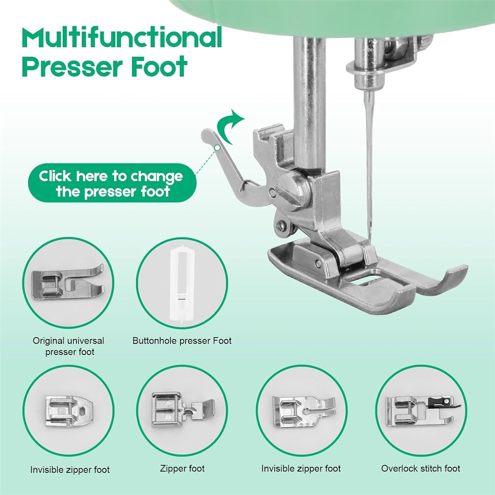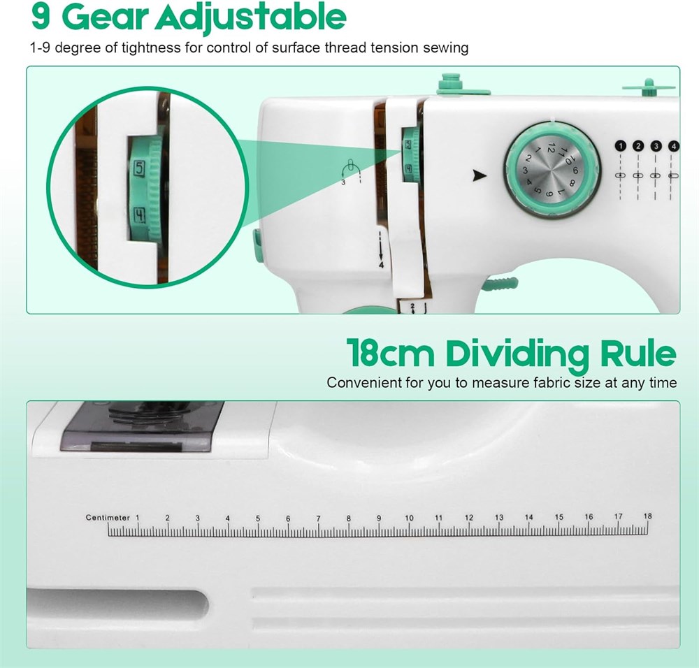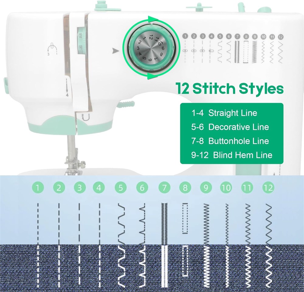 Dual-Control Sewing with Adjustable Speeds : Our sewing machine provides versatile control with both foot pedal and push-button operation. The push-button mode offers two preset speeds (low/high), while the foot pedal allows gradual speed adjustment. This dual-control design ensures precision stitching for all skill levels, whether working with delicate fabrics or thicker materials. 12 Built-In Stitches & Reverse Stitching : Enhance your sewing projects with this mini sewing machine featuring 12 stitch options: straight stitches (1-4), decorative stitches (5-6), buttonhole stitches (7-8), and overlock stitches (9-12). Easily switch between patterns using the rotary dial. The reverse stitch function strengthens seams simply press and hold the switch for reinforced stitching. Easy Setup for Beginners & Experts : Designed for hassle-free use, this sewing machine features double-needle, double-thread stitching for diverse projects. Intuitive threading guides on the machine body simplify setup, while video tutorials and a detailed manual offer step-by-step assistance. Whether you're a beginner or an experienced sewist, these resources ensure smooth operation. Adjustable Tension & Versatile Performance : Achieve perfect stitch quality with adjustable thread tension (1-9 settings) for different fabric types. The built-in LED light brightens your workspace, and the powerful motor handles up to 6 fabric layers. Compact and lightweight, this machine is perfect for home use or on-the-go sewing. Complete Multi-Function Kit : Includes a sewing threads kit, 5 spare needles, 1 twin needle, with 5 specialized presser feet and a universal foot. This complete set enables diverse sewing techniques - from basic seams and decorative stitches to buttonholes, zipper installation, and sleeve/hem sewing with the free-arm function. (Note: The machine has been threaded from the manufacturer and the cloth is to test the machine NOT a USED product)