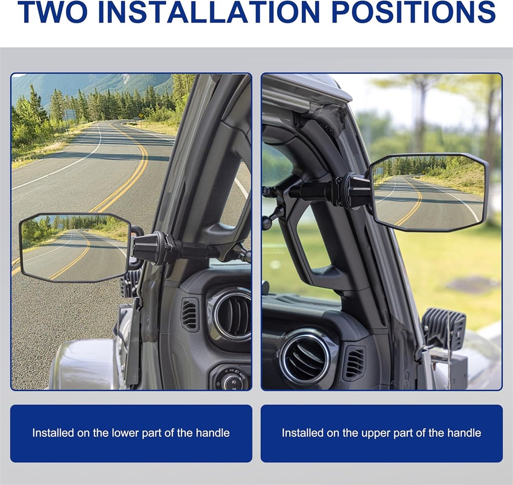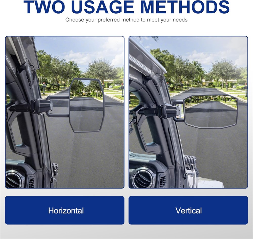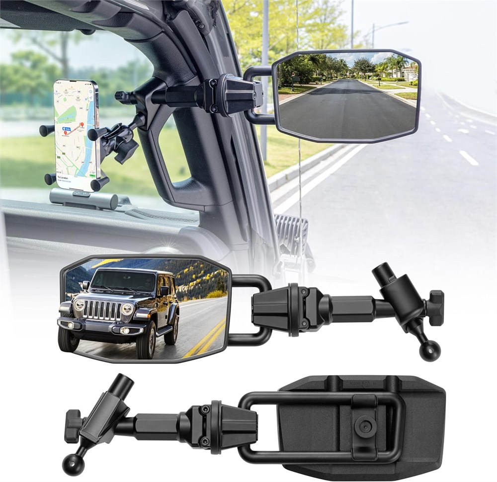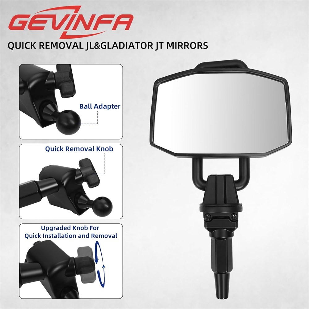 Compatible With Upgraded Wrangler mirrors door off suitable for Wrangler JL and Gladiator JT 2018-2023,NOTE: NOT FIT 2024 Wrangler& Gladiator. Multiple Adjustment Methods GEVINFA Gladiator JT side doors off mirrors has 4 ways to adjust the angle and is composed of multiple structural devices. You can adjust the entire mirror 360 degrees, or move the mirror up and down, back and forth. At the same time, you can also adjust the mirror horizontally or vertically according to your needs, as you wish! UPGRADE DESIGN-Quick Removal Our Gladiator JT mirrors have a quick detachable feature, eliminating the need for you to install them with any tools. You only need to install our special knob clockwise to the corresponding hole position to complete the installation. Compared to ordinary mirrors on the market, you don't need to drill holes or tighten screws. It only takes a very short time to install GEVINFA's jl doors off mirrors onto your car! UPGRADE DESIGN-Multifunctional Ball Head This mirrors doors off uses a 17mm metal ball adapter, which allows you to install the phone holder by aligning the hole with the ball head. You can also choose the gift included in the packaging: a phone holder.NOTE: that mount is actually a steel threaded ball that guides into the recessed mounting bolt hole that attaches to the existing grab handle. You can choose to install it or not, if you so wish. Stable and High-quality Materials The Gladiator accessories are made entirely of heavy-duty metal structure, and the Gladiator JT side mirrors have a streamlined design that won't shake during your driving. The surface adopts a special coating, which has functions such as anti-corrosion, rust prevention, and longer service life. We also come with detailed installation instructions, you just need to follow the instructions and you can easily install the mirror and ball head adapter.