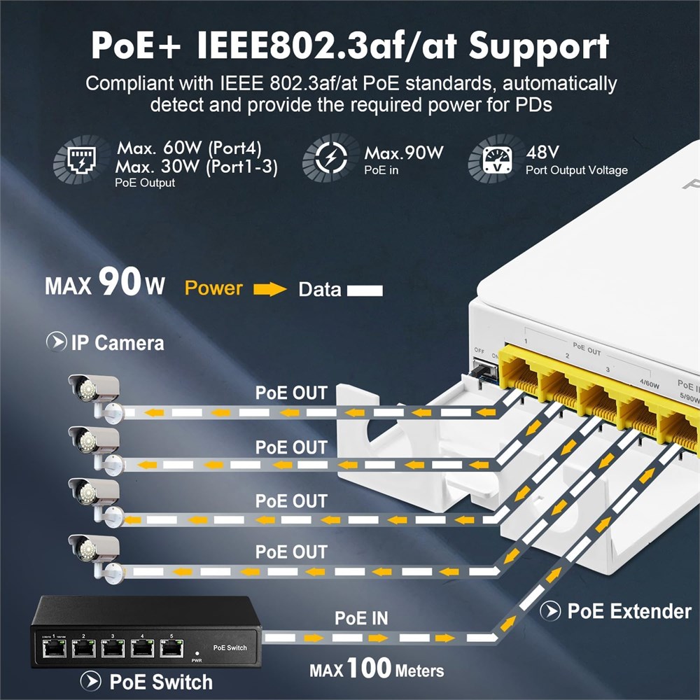 Gigabit PoE Passthrough Include 1 PoE In 4 PoE Out Gigabit Ports, 10/100/1000Mbps rate. Powered by PoE network, no AC power supply required, Max PoE Input IEEE802.3af/at/bt 90W. IEEE 802.3 af/at/bt Support standard PoE, Input Max 90W(IEEE802.3bt), Port 1-3 Output Max 30W(IEEE802.3at), Port 4 Output 60W(IEEE802.3bt). PoE Voltage 44-57 Vdc. PoE pin: Input: 1/2 (+), 3/6 (-), 4/5(+), 7/8(-); Output Port 1-3: 1/2 (+), 3/6 (-); Output Port 4: 1/2 (+), 3/6 (-) 4/5(+), 7/8(-) Outdoor weatherproof Industrial grade ABS polymer material shell, cable interface all protected in the shell, with better waterproof, dustproof, snowproof effect, more suitable for outdoor use; also suitable for complex indoor environment, such as warehouses, computer rooms, garages, attics, etc. Plug & Play Support power detection automatically detect devices, just plug in the ethernet cable, connect directly to the device, led display the port status, without configuration. *Please note not support 24V passive PoE*. Support VLAN mode, controlled by dipswitch Easy Install Support wall mount, smaller size save space, suitable for many positions. Support 3-level cascading, can connect poe AP, camera, phone and other POE devices, extender POE coverage at low cost.
