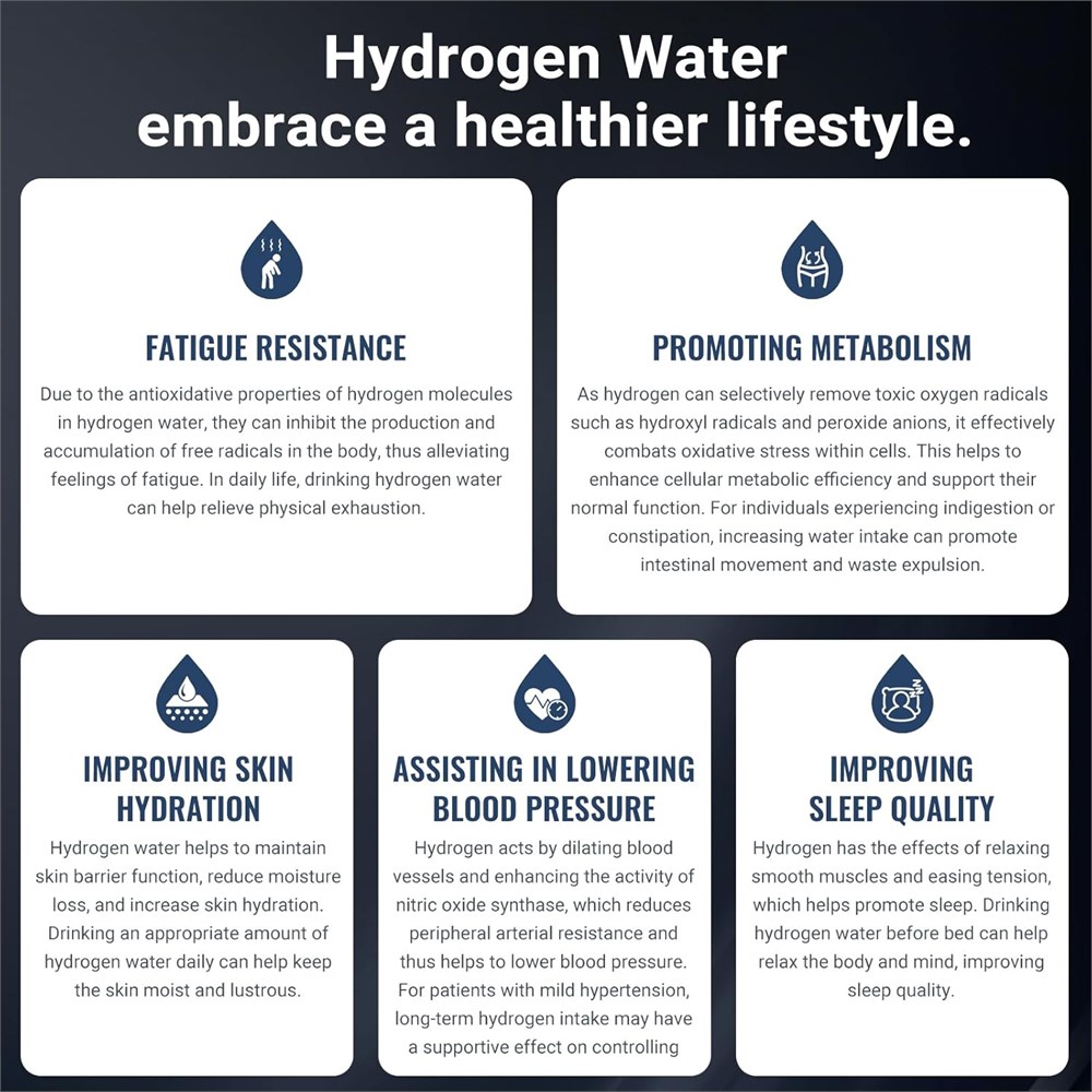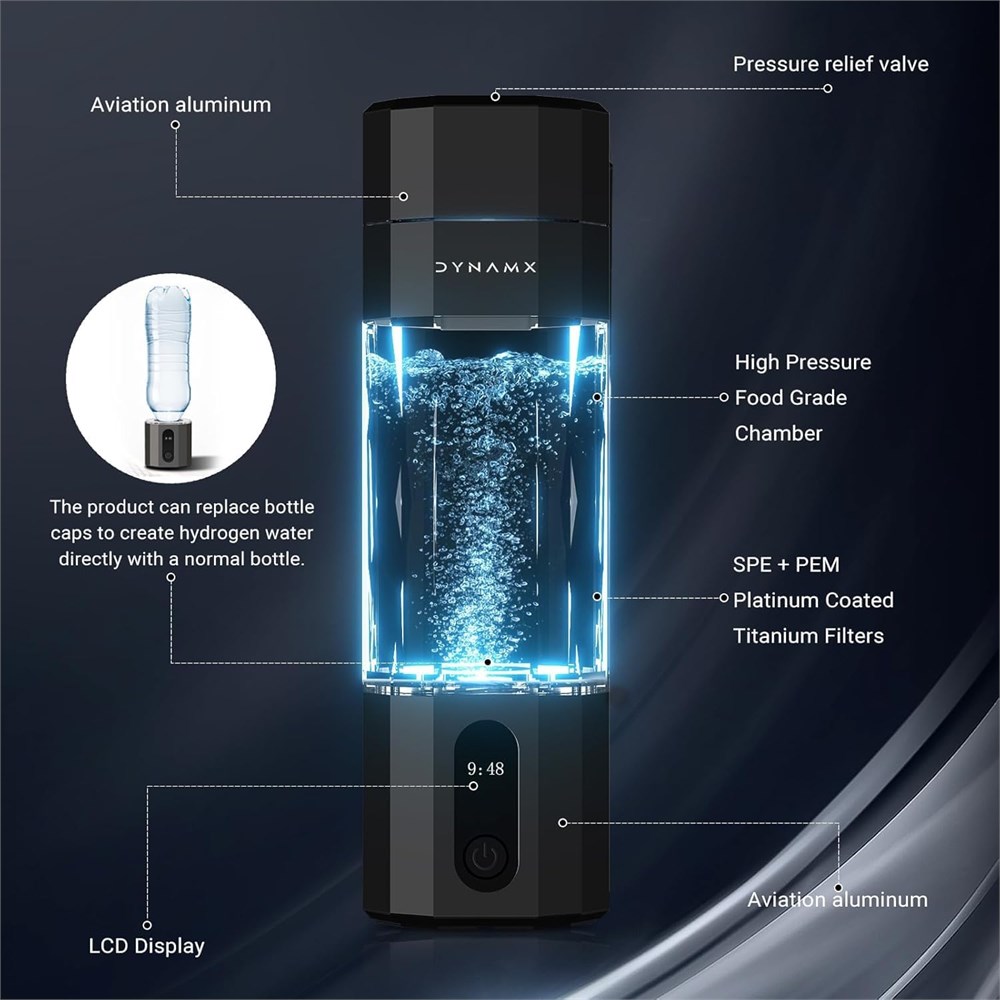 Faites l'exp rience de l' lectrolyse de nouvelle g n ration avec l' lectrolyse polym re solide (SPE) et la membrane d' change de protons (PEM) pour une eau hydrog ne ultra-pure jusqu' 8000 PPB. Con u pour les amateurs de bien- tre s rieux. Suivez la concentration d'hydrog ne et le compte rebours en temps r el. Basculez entre deux modes optimis s avec une interface l gante et conviviale. Construit en polycarbonate de qualit alimentaire, aluminium a ronautique et titane rev tu de platine. Sans BPA, sans odeur, durable et con u dans un souci de l'environnement. Avec une capacit de 210 ml et une construction l g re, elle est parfaite pour votre bureau, sac de sport ou bagage main. Hydratez-vous plus intelligemment, o que vous alliez. Une eau riche en hydrog ne quotidienne peut r duire le stress oxydatif, am liorer la vigilance et soutenir le confort des articulations, lib rant une version plus nergique et quilibr e de vous.