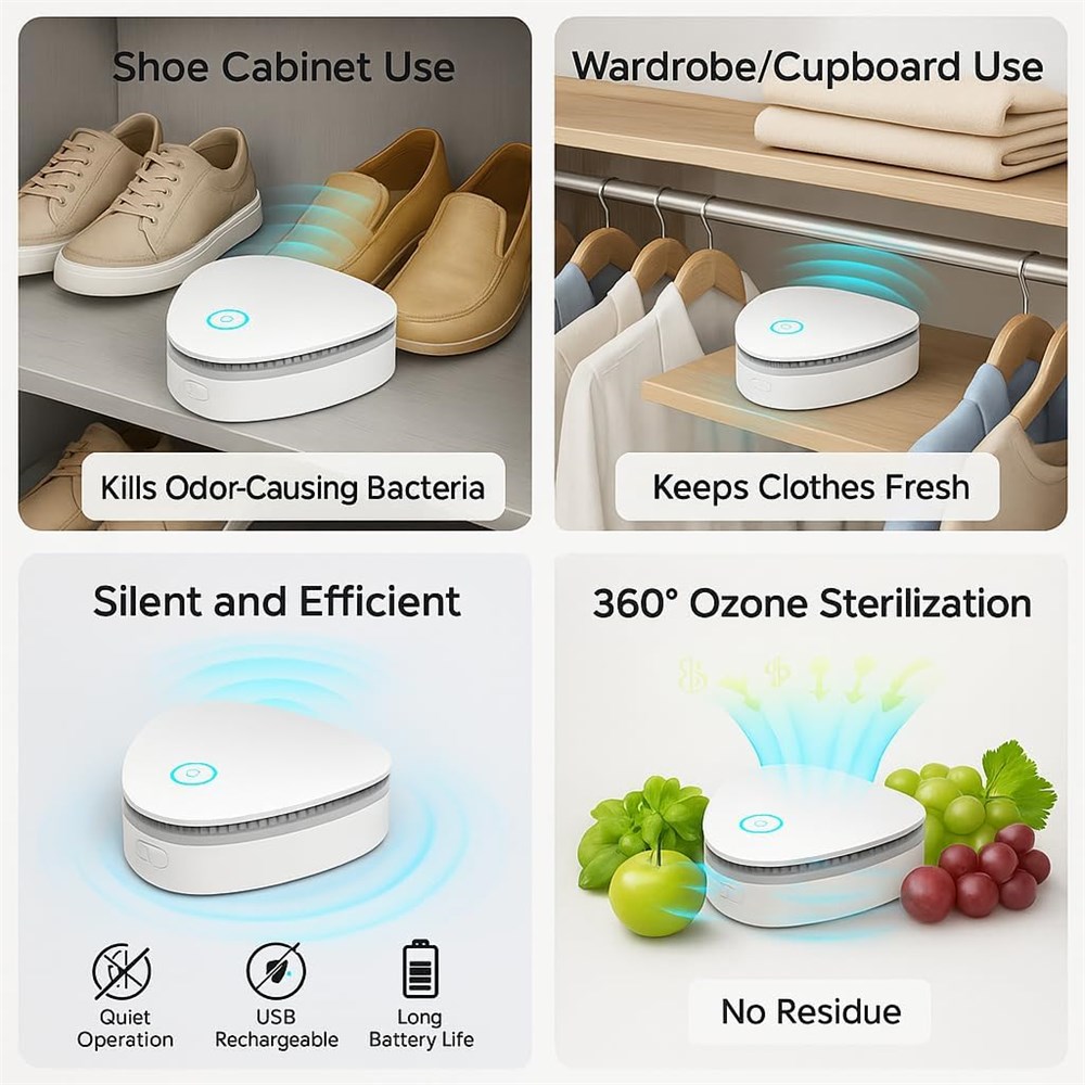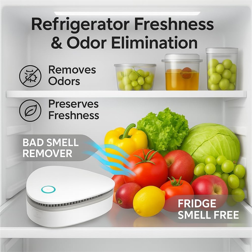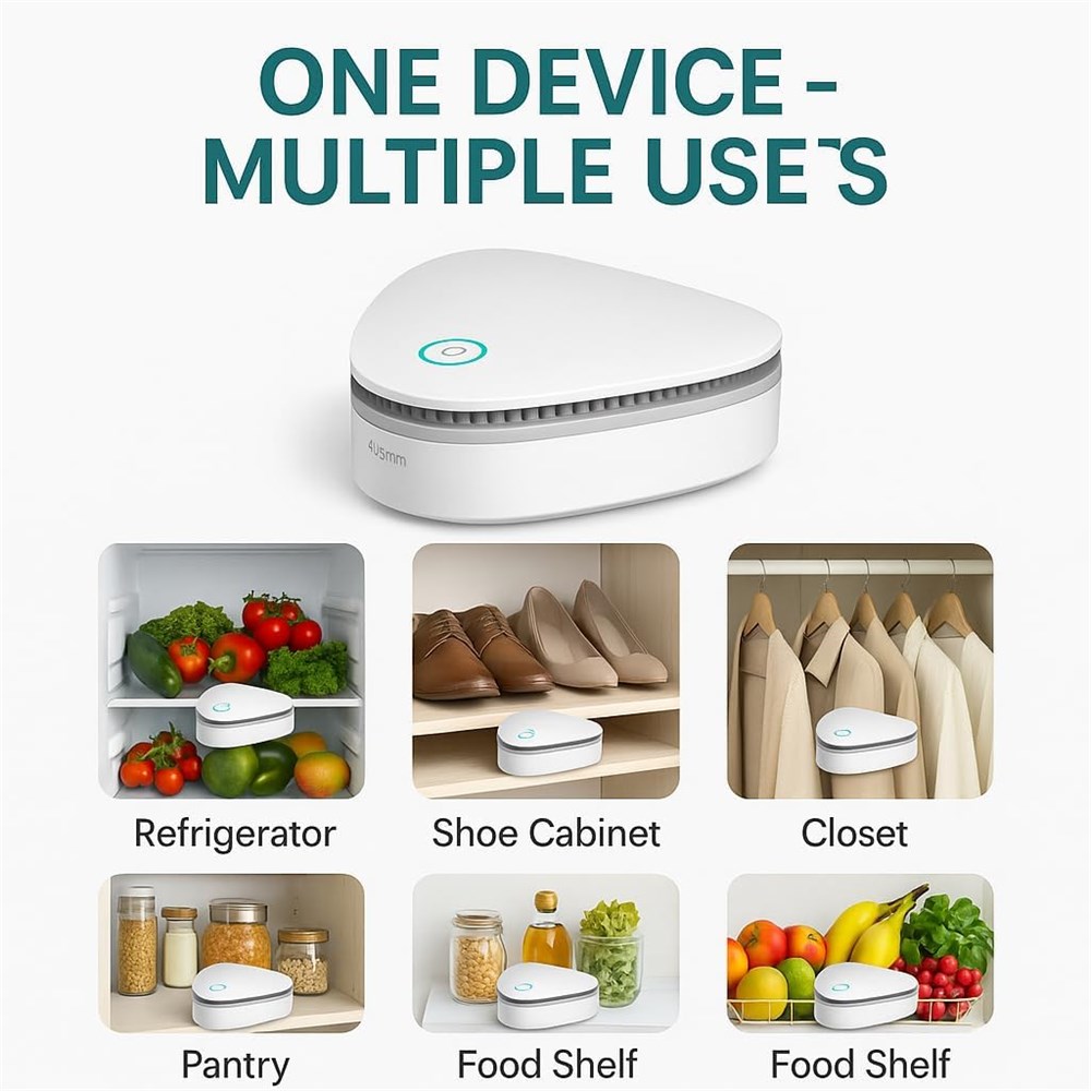 1 Keeps Your Fridge Fresh & Clean Designed to help reduce everyday odors inside refrigerators, freezers, coolers, and pantry shelves. Ideal for maintaining a cleaner and more comfortable kitchen environment. 2 Long-Lasting Performance for Daily Use Built with high-capacity odor-absorbing material that works continuously for weeks. Rechargeable battery, No refills needed. Perfect for family homes, dorms, RVs, and office break rooms. 3 Compact, Space-Saving Design Slim shape fits easily in tight fridge spaces without blocking airflow. Great for vegetable drawers, meat compartments, lunch boxes, and storage bins. 4 Multipurpose Odor Control Around the Home Suitable for refrigerators as well as closets, shoe cabinets, gym bags, cars, and small storage areas where unwanted smells can build up. Safe, simple, and mess-free. 5 Smart, Compact & Automatic Operation Sleek, modern design with automatic on/off cycle for effortless use. The mini ozone deodorizer fits easily in small spaces yet delivers powerful performance. Perfect ozone deodorizer for refrigerator, kitchen, and storage areas to maintain long-term freshness. Note: This product is not intended for use in bedrooms, living spaces, or any area occupied by humans or pets during operation.