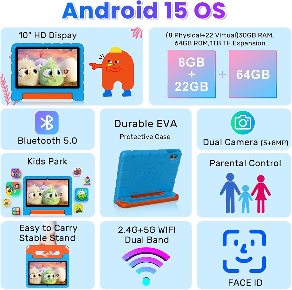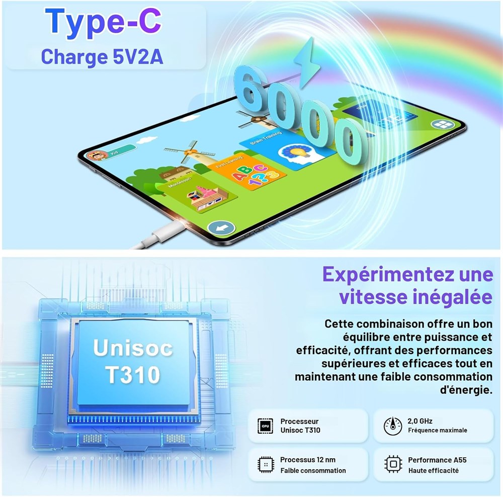 Performance intelligente avec Android 15 et Gemini AI 2.0 : aliment e par le dernier syst me Android 15 (b n ficiant d'une s curit /confidentialit am lior e et d' limination des publicit s) et d'un processeur haute performance de 2,0 GHz, cette tablette g re les applications multi-t ches et les grandes applications en douceur : compagnon d' tude pour enfants, centre de divertissement des parents Am lior par Gemini AI 2.0, il agit comme un compagnon d'apprentissage personnalis pour les enfants, aidant aux devoirs, expliquant les concepts et s'adaptant au rythme d'apprentissage des gar ons et des filles. Zone d'apprentissage s curis e contr l e par les parents et protection des yeux La tablette ZIOVO est livr e avec un lien familial pr install . Les parents peuvent limiter le temps d' cran, d finir un mot de passe, d finir des profils s par s pour chaque enfant, ajouter ou bloquer des applications, filtrer les pages Web dangereuses. La t l commande vous permet de garantir un environnement en ligne s r sans surveillance constante. Avec r glage automatique de la luminosit et l' cran HD respectueux des yeux prot ge les jeunes yeux pendant les longues sessions d'apprentissage. Pr install avec iwawa & Kids Space, qui comprend Montessori, Brain Training et d'autres jeux d'apprentissage et ducatifs pour les enfants. cran HD de 10,1", deux haut-parleurs et Widevine L1 : l' cran tactile HD de 10,1" avec r solution de 1280 x 800 offre des visuels nets et vifs sous tous les angles, jumel deux haut-parleurs pour un son immersif (id al pour les vid os, les jeux et les le ons), permettant une exp rience audio de qualit audiophile via un casque filaire USB de 3,5 mm. Certifi par Widevine L1, il diffuse du contenu ducatif HD de Netflix, Disney+ et Amazon Prime Video de mani re transparente, transformant le temps de jeu en moments d'apprentissage enrichissants pour les enfants. Capturez des moments avec la cam ra arri re 8MP et la cam ra frontale 5MP. Stockage extensible de 30 Go + 64 Go et batterie de grande capacit de 6000 mAh : avec 30 Go + 64 Go de stockage interne (extensible 1 To via microSD), il y a suffisamment d'espace pour les films, photos, applications pr f r s de votre enfant (par exemple, Kindle, Disney+) et le mat riel d'apprentissage. Certifi GMS pour un acc s complet 3M+ et des milliers d'applications ducatives sur Google Play, y compris les applications essentielles (Gmail, Microsoft Office, Instagram, Skype..). La batterie haute capacit de 6000 mAh prend en charge une utilisation mixte, parfaite pour les journ es scolaires, les voyages en voiture ou les sessions d'apprentissage prolong es, assurant un plaisir et une ducation stables et ininterrompus. WiFi double bande 2,4 G/5 G et Bluetooth 5.0 : profitez d'une connectivit stable et rapide avec WiFi double bande 2,4 G/5 G : 2,4 G pour une large couverture (id al pour une utilisation dans toute la maison) et 5G pour des vitesses ultra-rapides (parfait pour le streaming ou les appels vid o avec la famille). Bluetooth 5.0 se connecte facilement une connectivit multi-appareils transparente pour votre tablette, permettant un transfert plus rapide de photos/vid os et une exp rience utilisateur plus flexible. La reconnaissance faciale ajoute une couche suppl mentaire d'acc s s curis , tout en prenant en charge l' cran partag , la projection d' cran et l'enregistrement d' cran, am liorant ainsi la polyvalence pour tudier ou se divertir. Achetez en toute confiance : tui s r et durable r sistant aux chocs La tablette comprend une coque en EVA de qualit alimentaire absorbant les chocs, parfaite pour les petites mains qui aiment parfois faire tomber leurs appareils, tandis que le support r glable cr e l'angle de vue id al pour chaque instant, la conformit la certification europ enne RoHS garantit des mat riaux sans odeur et non toxiques, prot geant la sant de votre enfant. C'est un cadeau id al pour un anniversaire, No l, les vacances pour les enfants g s de 3 12 ans obs d s par les jeux ducatifs.