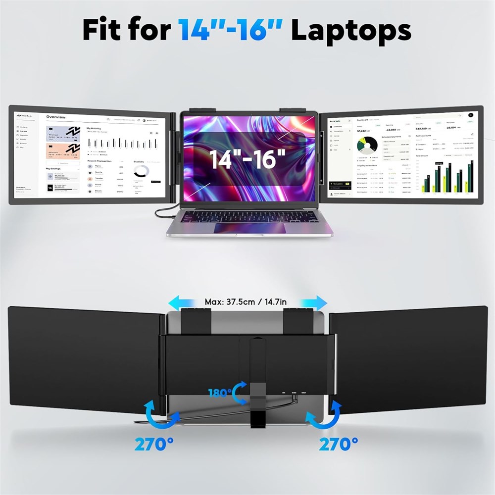 Easy connection & Widely Used : This Laptop Screen Extender has 3 USB-C ports, When connected to Windows, Only One USB-C cable needs to be used. When connected to macOS, two USB-C cables need to be connected. No driver or APP need. This screen extender is specifically designed to fit laptops ranging from 14" to 16". Note: Please make sure your MacBook supports 2-display connection or it only supports mirror mode & single screen mode. Exceptional Visual Performance HONGO 14 inch External Monitor for Laptops provides 1080P FHD IPS screens, With a brightness of 300 nits and a contrast ratio of 1000:1, the portable monitor ensures a clear and visually stunning workspace. In addition, the dual monitor support 270 rotation, and the bracket can be adjusted 180 , you can adjust according to your own needs. Triple Laptop Monitors This screen extender portable laptop allows you to have three screens for office work in one second, enhance your productivity by up to 300%, allowing you to efficiently multitask with multiple windows. Say goodbye to the inconvenience of constantly switching between applications on a single laptop. Ideal for individuals who are always on the go, remote workers, IT professionals, movie enthusiasts, programmers, and more! Widly Compatible Compatible with Windows and macOS systems, ideal for 14"-16" inch laptops. Support Extend/Mirror/2nd Screen/Portrait/Pre Mode. Each screen of this laptop monitor extender can be adjusted, turned off, and awakened individually. Note: Your device must have Thunderbolt 3.0/4.0 or USB 3.1 Type-C DP ALT-MODE port. Portable The laptop monitor extender is lightweight at just 3.48LB, foldable and compact design allows this laptop extender screen to easily fit into a bag, making it perfect for travel and business trips.