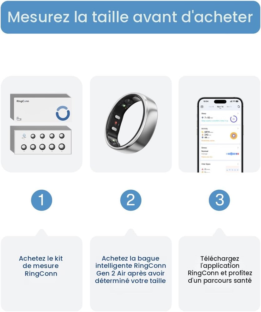 Informations sur la sant aliment es par l'IA La bague intelligente RingConn Gen 2 Air int gre l'IA avec des donn es multi-capteurs pour suivre en continu les indicateurs cl s de sant tels que le sommeil, les niveaux de stress, l'activit physique et les cycles menstruels. Son assistant IA int gr fournit votre rapport personnalis et vos conseils pour am liorer votre bien- tre et vos habitudes quotidiennes Taille avant d'acheter RingConn Gen 2 Air utilise des normes de taille uniques, diff rentes des tailles de bague standard. Achetez le kit de taille RingConn pour trouver l'ajustement le plus pr cis et le plus confortable pour votre doigt Sans sensation de port D couvrez un design confortable et l gant avec un profil super fin de 2 mm et un poids de seulement 2,5 g. N'interf re pas avec vos mouvements, que vous fassiez de l'exercice, de la course, de la plong e ou de toute activit physique, et reste confortable sans vous distraire lorsque vous dormez ou travaillez Dur e de vie de la batterie plus longue Profitez de jusqu' 10 jours d'alimentation ininterrompue avec une seule charge compl te qui se termine en seulement 90 minutes. Restez aliment tout au long de votre emploi du temps charg sans recharger fr quemment et maintenir efficacement la collecte de donn es continue long terme tanche pour chaque aventure : avec un indice d' tanch it IP68 (assurant une performance d' tanch it exceptionnelle test e des profondeurs de 100 m), RingConn Gen 2 Air r siste aux activit s quotidiennes comme le lavage des mains, les douches et la pluie, ainsi que les sports nautiques, y compris la natation et la plong e. Con u pour rester en place travers tout, sa construction durable emp che les dommages caus s par l'eau et assure une performance durable Nouvelle fonctionnalit pour trouver votre bague La nouvelle fonction d'application offre un suivi et une r cup ration sans effort des anneaux avec un guidage intuitif tape par tape, ce qui permet d' conomiser du temps et des efforts. Profitez de la tranquillit d'esprit en sachant que votre bague est toujours port e de main Contenu : 1 RingConn Gen 2 Air, 1 station de charge, 1 c ble USB-C vers C de 1 m, 1 manuel de l'utilisateur (fran ais non garanti), un service client efficace.