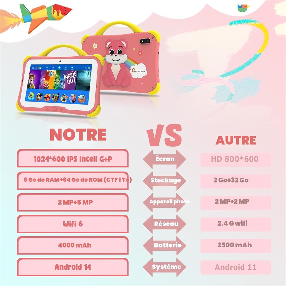 Double tablette de contr le parental : la tablette CWOWDEFU pour enfants est sp cialement con ue pour les enfants, avec un double contr le parental pr install avec le mode enfant CWOWDEFU et le mode lien familial Android 14. La fonction de filtre d' ge garantit que les enfants ne voient que le contenu filtr , et le syst me de protection par mot de passe de contr le parental permet aux parents de contr ler la tablette Android et d'ajouter des applications au profil de leur enfant en fonction de l' ge. Prend en charge jusqu' 4 enfants, offrant toujours un environnement en ligne s r et propre pour que votre enfant puisse jouer heureux et que les parents aient l'esprit tranquille Compacte et grande capacit : cette tablette pour enfants am lior e dispose d'un petit corps portable avec une grande capacit de stockage interne de 8 Go de RAM (4 + 4) + 64 Go de ROM et un emplacement pour carte micro SD qui peut tre tendu 1 To. Vous pouvez t l charger plus de contenu, ce qui permet aux enfants de regarder des vid os sans wifi lors de vos sorties, permettant aux enfants de jouer plus confortablement cran HD, protection des yeux Cette tablette pour enfants dispose d'un cran d'affichage IPS G+P IPS, r duisant efficacement les dommages oculaires caus s par les appareils lectroniques, permettant aux enfants de passer un moment plus s r et plus confortable. Longue dur e de vie, unique en son genre Cette tablette indispensable pour enfants est livr e avec une batterie int gr e de 4000 mAh, avec une autonomie de veille de 7 pouces allant jusqu' 5 jours, parfaite pour votre enfant utiliser pendant les voyages. Vous n'avez pas vous soucier que la tablette soit court de batterie et rend votre enfant agit , car elle peut tre facilement charg e via le port USB de type C. Tablette Android 14 pour enfants : profitez de la tablette Android 14 Kids haut de gamme avec des fonctionnalit s telles que la navigation GPS, le contr le parental, la mise en miroir d' cran sans fil et le mode de protection des yeux. La performance maximale int gr e un puissant processeur quadric ur assure un fonctionnement fluide pour toutes les t ches et besoins de divertissement. Cadeau id al pour les enfants : cette tablette Android pour enfants est livr e avec une coque anti-chute unique, sp cialement con ue pour les enfants. Prise en main confortable, portable, et particuli rement adapt aux enfants g s de 2 10 ans. Que ce soit pour des vacances ou un anniversaire d'enfant, c'est le meilleur cadeau de tablette pour votre enfant.