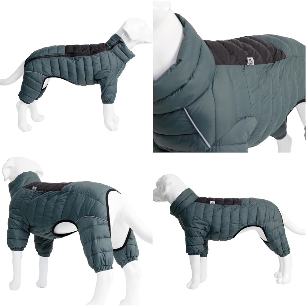 STAY WARM & STYLISH - This warm dog jacket in 4-legged design to wrap all four legs in warmth, which helps keep your furry friend cozy and fashionable. With a trendy color-block pattern, the side zipper features a reflective strip for a touch of urban chic, this dog coat make your pup the envy of the dog park. WATERPROOF & WINDPROOF - The exterior of this dog winter coat is meticulously crafted from high-strength waterproof nylon. Rain or snow, your canine companion will stay dry and comfortable, allowing for enjoyable walks even in winter's worst weather. Light and comfortable, it's a must-have for your winter outings. ENJOY LUXURY OF WARMTH - Hand-stuffed with pure cotton, the interior of this dog snow suit provides unparalleled warmth. Your dog will experience soothing, uniform coziness whether indoors or out. The chest and neck areas are adorned with adjustable straps, allowing for a perfect fit and ensuring maximum comfort. TAILORED FIT & SIZING - With 7 available sizes and four attractive colors to choose from, this dog jacket suits a wide range of small, medium, and large dog breeds. To ensure the perfect fit, please measure your dog's back length and chest girth before selecting a size. Refer to our size chart for the most suitable size within your dog's measurement range. ENJOY GREAT OUTDOOR TIME - The safety reflective strips on the back of this dog winter coat provide enhanced visibility during nighttime walks and outdoor adventures, easy on and off, perfect for everyday wear, outdoor activities, and adventurous outings, this winter dog coat is a versatile addition to your pup's wardrobe.