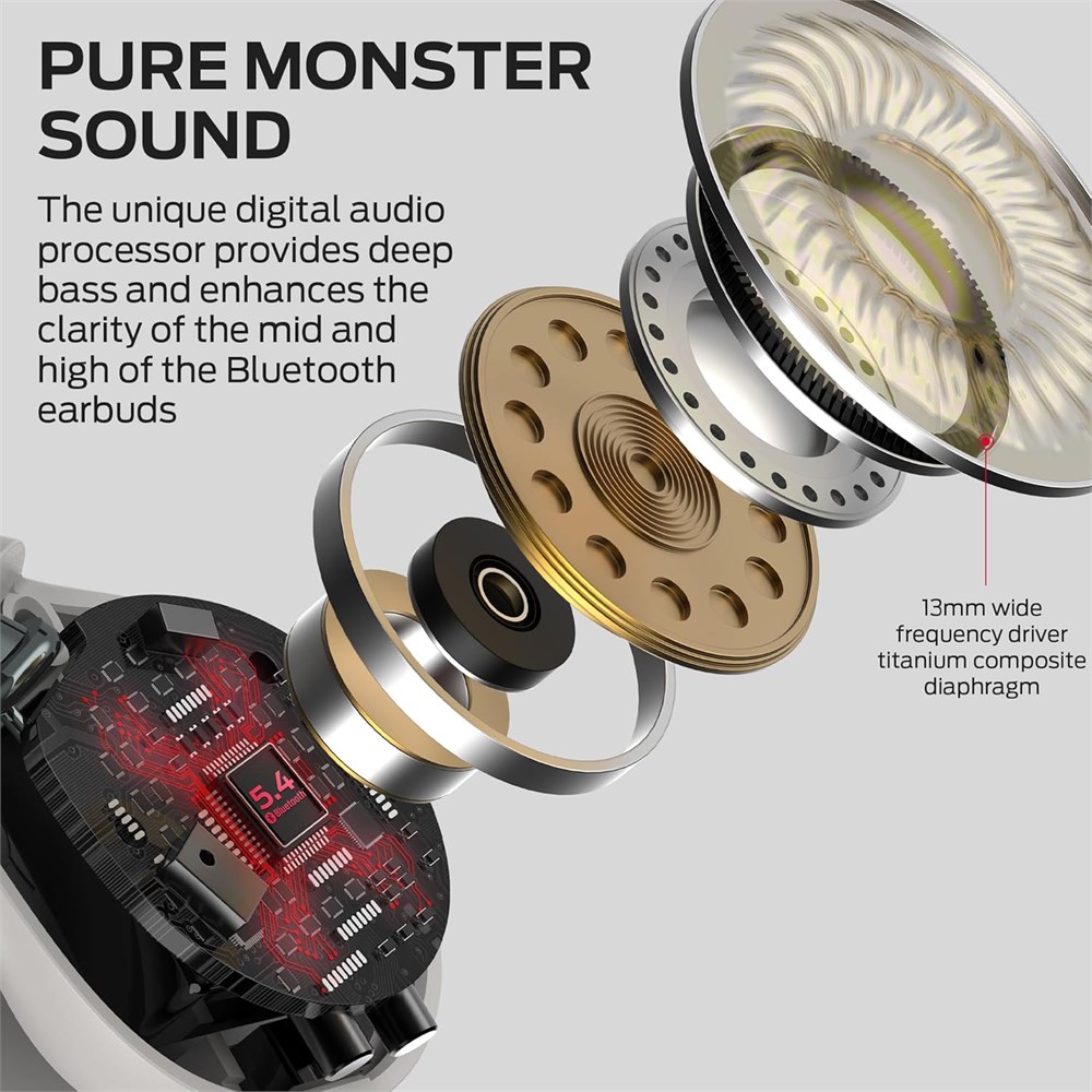 Clip-on Design With Pure Monster Sound - Monster Wireless Earbuds adopt the unique digital audio processor and powerful 13mm drivers to enhance and reproduce perfect Hifi immersive stereo audio, equipped with Qualcomm apt-X high-definition audio decoding to restore richer sound details. The open ear clip earbuds are based on an ergonomic design to prevent the complete sealing of the canal, reducing discomfort during long wear. Comfortable And Secure Fit For Everyday Use - Monster open ear earbuds weigh ONLY 0.2 oz, typically lighter and more breathable than other headphones, which makes them more comfortable to wear for extended periods of time. Constructed from innovative, non-deforming hard-shell material, the clip on earbuds are meticulously designed to retain their shape for a consistently secure fit, no matter how much you use them. ENC Noise Reduction For Crystal Clear Call - Adopt environmental noise reduction technology to monitor the sounds and instantly produce an opposite signal to reduce background noise, the bluetooth earbuds allows you to hear crystal clear calls like you are communicating face to face with others, enjoy clear hands-free calling, and immerse in the music, creating a personal audio world. 21H Long Playback With Fast Charge - On a single charge, Monster open ear headphones last around 7 hours (at 50%-60% volume). With recharges provided by its compact charging case, you can use them non-stop for 21 hours. Designed with Type-C fast charging, enjoy 1hour listening with a 10-minute charge. IPX6 Water Resistant For Any Workouts - Designed for active lifestyles, it prevents water and sweat from penetrating and can be used in any harsh environment. Monster open earbuds are the perfect sports partner for running, cycling, mountaineering, and sports and fitness enthusiasts, without worrying about sweating profusely.