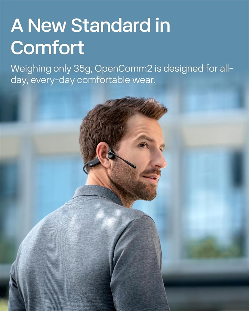 Advanced All-Day Comfort - This portable open-ear headset weighs only 35g, and is engineered with a flexible frame and IP55 water-resistant soft silicone finish for comfortable, mobile workwear day after day Crystal-Clear Calls - Feel like you are conversing in person with Shokz 7th generation Bone Conduction Technology, powerful PremiumPitch 2.0 audio, and a noise-canceling microphone with DSP technology Multipoint Pairing - Reliable Bluetooth connectivity allows you to easily pair your headset with two devices simultaneously and seamlessly toggle between them with the included Shokz App Intuitive Integrated Controls - Precisely adjust your volume, mute and unmute calls, play or pause audio, and more with a simple press of the headphone's physical control buttons Effortless USB-C Charging - Stay connected and collaborative with up to 16h of talk time and 8h of listening time per charge, and benefit from a 5-minute quick charge that provides 2h of talk time.