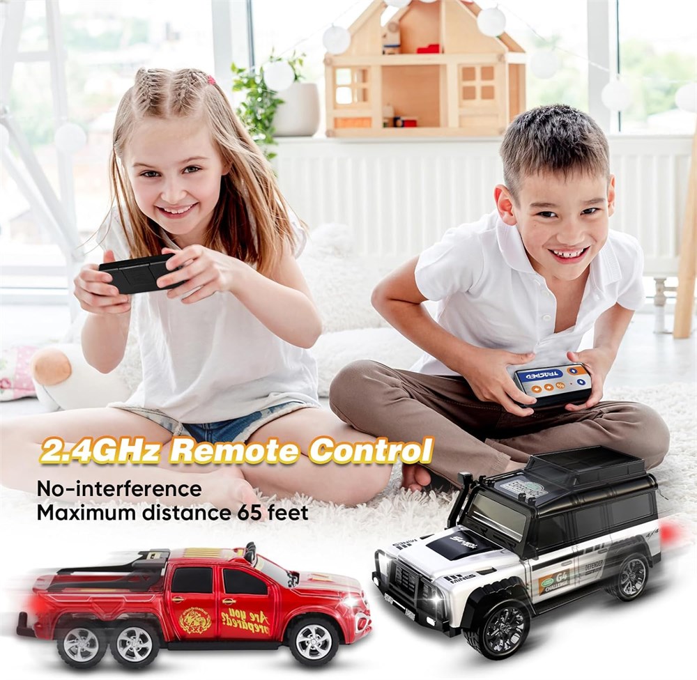 No-interference and Low Lag: RC truck is equipped with 2.4GHz remote control, providing fast response and a 65 feet control range. Each car and remote control are exclusive connection not to interfere with each other. Enhance Kid Spatial Awareness: Multi-directional control and adjustable speed let your child foster direction judgment and fine motion perception skills. The compact remote control helps child exercise finger and eye coordination. Robust and Durability: This mini rc car crafted from high-quality alloy and ABS material, withstands high-speed adventures and many impacts will not easily break, fall off and be damaged. Let your children enjoy enduring fun and play. USB Type-C Charging: This micro rc car equipped with a 3.7V 160mAh rechargeable lithium battery, providing up to 60 minutes of play fun on a single charge. The included USB-C cable ensures easy and fast charging (Adapter not included). Excellent Performance: This truck cars toys are equipped with professional anti-skid tires and a powerful motor, which can adapt to many terrains. Whether it's floor or carpet, whether turning or climbing, this fast rc car maintains strong performance. Realistic Die cast Cars Model: Exquisite die-cast metal construction and car body stickers, as well as equipped headlights and taillights, bring a realistic and immersive experience. This mini cars not only fun to play but also a great display piece. Perfect Gift for Kids: RC car toys are the ideal choice for Festive and Birthday gifts for kids, If you are looking for a gift that is exciting, surprising and super cool for kids, this toddler remote control car will be a great choice. Packing List: Small rc car 1, Trailer car 1, Remote control 1, Type-C charging cable 1, User guide 1.