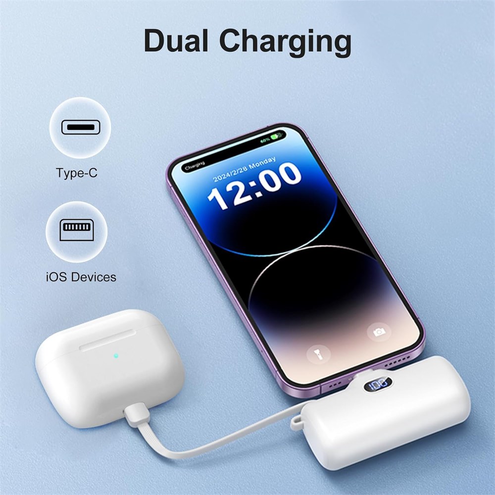 Simultaneously Charge Two Devices- With dual built-in ports (Lightning and USB-C), you can charge an iPhone and an Android phone at the same time. The 5000mAh battery provides 1-2 full charges for most smartphones, keeping you powered all day. Portable Charger with Built-in Connector & Cable- This compact power bank features a built-in Lightning connector for Apple devices and a built-in USB-C cable for Android phones, making it compatible with iPhone 16/15/14/13/12/11 series, X/XR/XS/8/7, AirPods, as well as popular Android devices like Samsung Galaxy, Google Pixel, and more. Enjoy true cable-free convenience anywhere. Ultra-Lightweight & Travel-Friendly- Weighing only 0.2lbs with a compact size of 3" x 1.18" x 0.98", this portable charger slips easily into your pocket or bag. Perfect for commuting, travel, and everyday use no extra bulk, just reliable power. Built-in Kickstand for Hands-Free Use- An integrated stand lets you prop your phone horizontally or vertically while charging ideal for video calls, streaming, or following recipes without holding your device. Advanced Safety & Overheat Protection- Equipped with intelligent safety chips to prevent overcharging, over-current, short circuits, and overheating. Designed to keep your devices and the power bank safe during use.