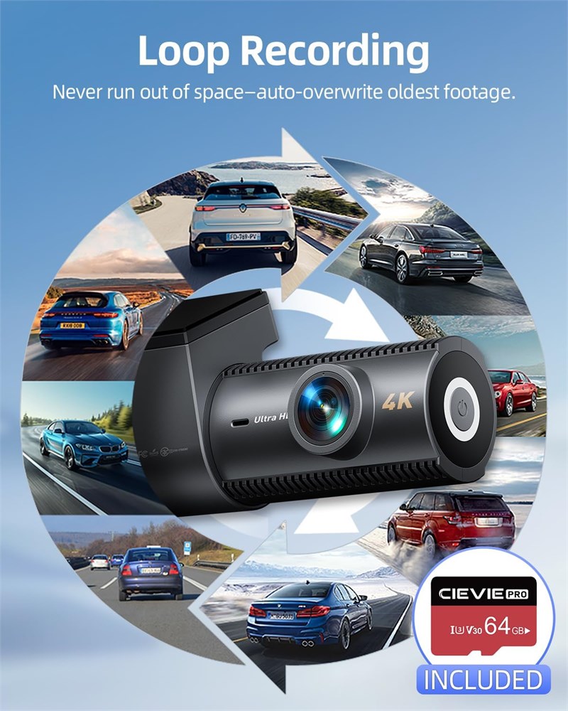 4K+1080P Dash Cam Front and Rear Camera The CIEVIE 4K+1080P dual dash cam enhances your road safety with ultra-clear front (4K) and rear (1080P) recording, wide viewing angles (170 front / 150 rear), and automatic incident recording with timestamps for evidence. It is NOT wireless and requires constant power from your car's 12V socket or a hardwiring kit. PRE-INSTALLED 64GB Card & Seamless Loop Recording The CIEVIE dash camera comes fully equipped with a 64GB SD card pre-installed* in the card slot, so you can start recording right out of the box. Thanks to seamless loop recording, old files are automatically deleted when storage is full, ensuring you never miss critical moments, even on long road trips. For optimal performance, format the card before first use and stick to Class 10 (or higher) microSD cards. G-Sensor Auto Lock & 24/7 Parking Surveillance This dashcam actively monitors with a built-in G-sensor that automatically locks and protects collision footage from being overwritten. For added security, pair it with the optional Type-C hardwire kit (sold separately) to enable 24/7 parking monitoring, safeguarding your vehicle against hit-and-runs or vandalism. Drive with peace of mind, knowing that every crucial moment is securely recorded. Faster 5.8GHz WiFi & Smart APP Control Control your dash cam via lightning-fast 5.8GHz Wi-Fi through the dedicated app: stream footage, download clips in seconds, or adjust settings directly from your phone. Easily share drives or incidents to social media with one tap. Tip: For optimal stability, disable VPN and CarPlay/Android Auto during the connection. Enhanced Night Vision & WDR Technology Don t let the dark hold you back this front and rear dash cam is equipped with an f/2.0 aperture and a 6-layer glass lens, significantly improving clarity in low-light environments. Thanks to Wide Dynamic Range (WDR) technology, it effectively balances intense glare and deep shadows to reveal more detail after dark. It s important to note: license plate clarity, especially at night, depends on sufficient ambient lighting. 360 Adjustable Design & Effortless Installation Our front dash cam comes with a compact 1.5 IPS HD screen that minimizes windshield blockage for a clean and discreet look. The front camera rotates 290 , while the rear extension camera supports full 360 adjustment, allowing precise aiming at specific areas and helping expand your view with minimal blind spots. A complete installation kit is included for quick and hassle-free setup. Friendly Reminders This dash cam front and rear camera operates through wired power connectivity within vehicles, utilizing either your car's cigarette lighter car charger (included) or a Type-C power cable (not included) for operation, while noting this model does not feature GPS capabilities.