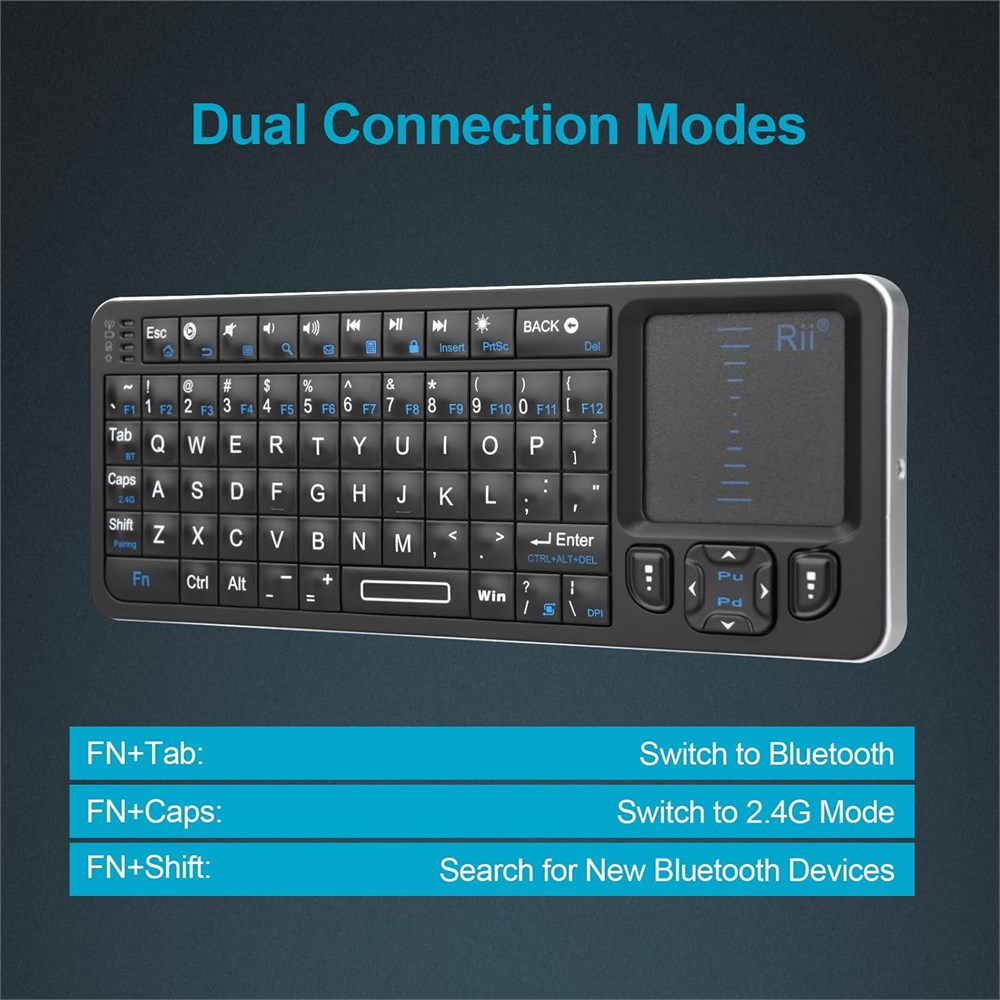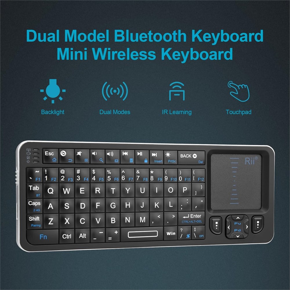 2in1 Bluetooth Dual-Mode Keyboard Rii mini keyboard with Bluetooth and 2.4G USB Nano Receiver connections, Standard handlable wireless keyboard for Smart TV, Android TV Box, HTPC. IR Learning Function TV Remote Small Bluetooth keyboard has IR learning function with 10 learning keys, keyboard, mouse and TV Remote all in one wireless mini keyboard. Touchpad and Hotkeys Mini wireless keyboard with multi-finger touchpad and mouse left & right buttons, easy operation as the wireless mouse to type/copy/paste. With 8 hotkeys, watching TV and browse the page more conveniently. LED Backlit Keyboard Portable wireless Bluetooth keyboard has LED backlit. Easy to operate in darkness. Type-C rechargeable keyboard. With auto sleep and wake-up function, save power and keep a long working time. Widely Compatible Rii Bluetooth keyboard as a remote control for Android TV box, smart TV, PC, x-box, desktop, laptop, smart phone. Standard mini keyboard for Windows, Mac, Android OS.