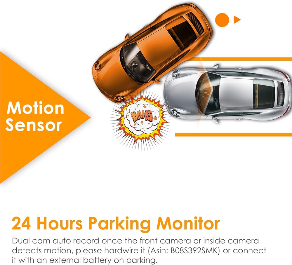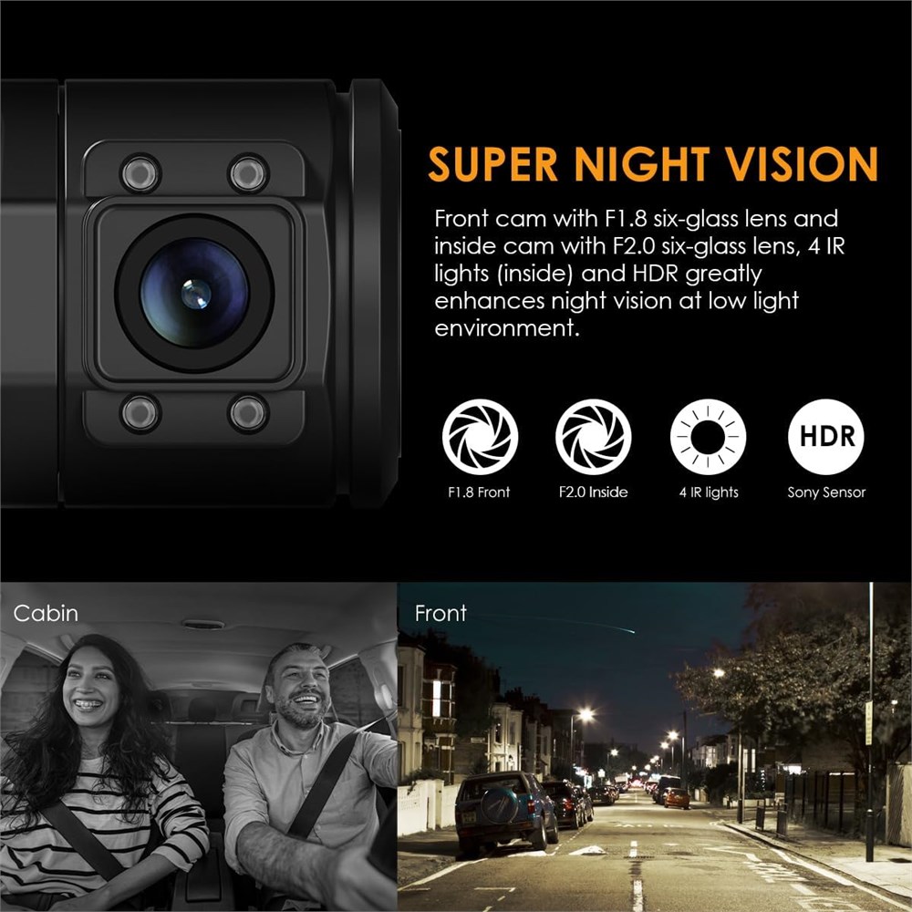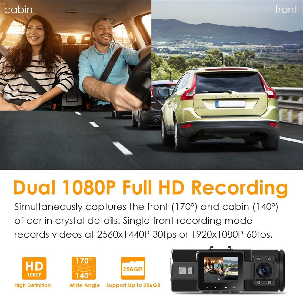 Front and Inside Dual 1080P Dash Cam The dual 1080P dash cam simultaneously captures the road front (170 ) and inside the cabin (140 ) in crystal details at dual 1920x1080P 30fps. It's your superior choice for Lyft, Taxi, Rideshare, and must-have for family road trip! 2.5K 1440P Single Front Recording Adopted advanced sensor, the front camera captures up to 2.5K (2560x1440P@30fps) footage with crystal detail in single front recording, helping you capture license plates as well as wider and clearer street details. Or you can switch to 1920x1080P@60fps mode to provide smoother video to record high-speed traffic. Inside camera body supports 80 up and down rotation. Infrared Night Vision Interior Car Dash Camera for Drivers Advanced sensor, F2.0 6-glass lens interior facing cam plus 4 IR LED lights greatly enhances night vision inside car at low light environment, making your driving more safer at night. F1.8 6-glass lens front facing cam and unique HDR video system automatically balance the light and dark areas of the video. Simply toggle the night vision modes by short pressing the power button of the car dash camera. 24/7 Parking Mode & Audio Recording Motion activated parking mode makes the dash cam for cars front and inside to auto record once the front or inside camera detects motion. Auto start and record when the ignition sparks up. Must be hardwired (Buy Separately, ASIN: B08S392SMK) or connected to an external battery. Easy to Install and Use & Auto LCD OFF This dashcam comes with a suction cup mount for you to easily install and remove without glue left. Auto LCD OFF timer ensure you won't be disturbed by another glowing rectangle, greatly improves the driving safety. With built in micphone, this front and cabin dash camera features excellent audio recording, which can be switched on/off at any time. Looping Recording Seamless Loop Recording overwrites the oldest footage with the newest when the SD card is full. N2 Pro supports up to 256GB micro SD card. (Buy Separately, ASIN: B081M5JR2C) Connecting optional GPS (Buy Separately, ASIN: B0BRZ1HTNK) to track the driving route, location and speed. Free GPS player with a zoom-in function offers high-resolution images that effectively capture license plate details.