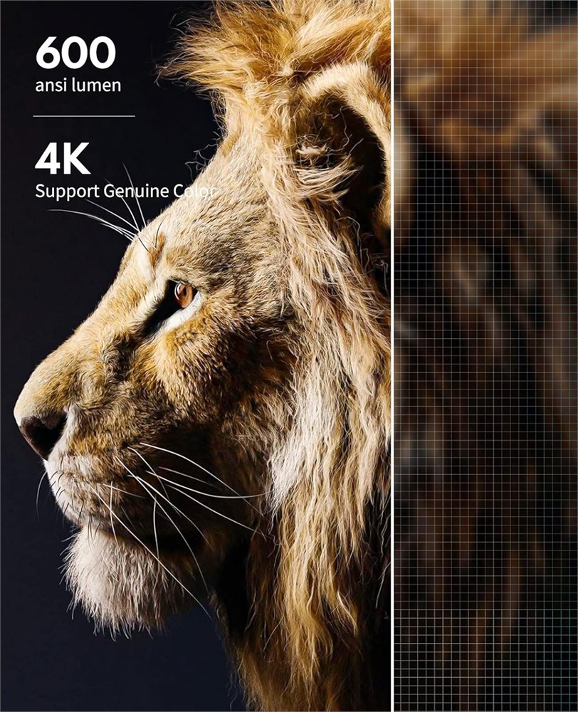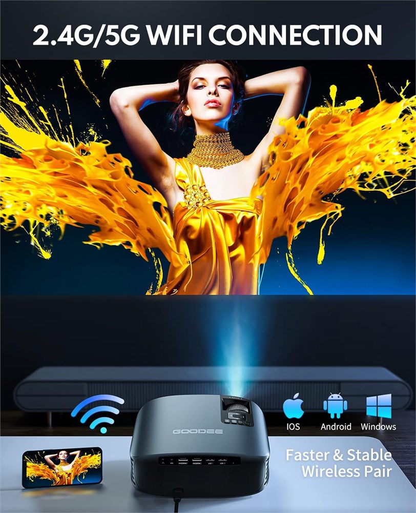 4K Projector & 600 ANSI Lumen: GooDee all new upgraded mini wifi projector adopts 6 layers high Refractive glass lens which means this portable projector will deliver a evenly distributed, no-blurry-edges image; Using Germany imported chips and Japanese native light bulbs which bouble level up the image brightness, clarity, color richness, restore the authenticity of color to the maximum extent. Best suits for indoor outdoor use. Faster & Stable 2.4G/5G WiFi & Bluetooth Connection: Owning GooDee projector with wifi and bluetooth, which allows you to synchronize smartphone screen by both 2.4G and 5G WiFi, Ultra-fast 5G WiFi offers you much smoother and lag free online video streaming experience. Just one -time wifi connection. By connecting newest built-in 5.2 Bluetooth, you can enjoy the various bluetooth speaker sound. 300 Max Screen with Zoom Function: GooDee outdoor movie projector provides zoom 50% to 100% which means you can adjust the screen size at a fixed place, you don t need to move the video projector any more. Just bring the home movie theater back to your home, enjoy ultra-clear large-screen movies as if you were in a movie theater. Dolby Audio & Built-in Hi-Fi Stereo Speaker: As a multi-function home cinema projector, YG600 Plus has built-in 2* 5W speaker giving a ultra clear and powerful sound. Just one click to start your night life. Genuine Dolby authorization, so that you will no longer have only the picture but no sound, and enjoy the ultimate 3D surround sound. No More Black dot: Adopting imported High-tech materials, it can block dust and prolong the life of the projector.
