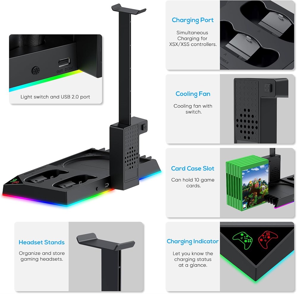 6 IN 1 Stand for XBOX SERIES X : Vertical stand for Xbox Series X combines the functions of console cooling fan, dual controller charger, 15 RGB lights modes, 2 x 1400mAh Rechargeable Battery, 10Pcs Game Discs Slots, headset stand, extra USB port, etc.,which greatly saves the space for gaming equipment,perfect integrated design to provide all the extra features you need. Please Note: The console, controllers, headset,charger cable and game cards are NOT included Cooling System for Series X Console : Different from the design of the fan at the bottom, the fan on the side can accelerate the air circulation inside the console system to cool it better.The metal base with 4 vents reserved for Xbox X console, helping to accelerate the hot airflow from the top of console out without blocking the natural circulation of airflow inside the console. The button can control the cooling fan anytime.Anti-slip rubber bottom will keep the stand tightly and stable. 15 Colorful Lighting Effects : There are 15 RGB bottom light effects - 7 monochrome light effects, 8 running lights and blinking effects, multiple light modes for you to choose from.The stand for xbox series x has a light memory function, long press the light button for 3 seconds to save the light mode and shut down. You can adjust the light mode according to your preferences, adding colorful and cool lights to your room to increase the atmosphere of the game. Quick Charging for Xbox Series X Console : You just install the battery into for Xbox Series X Controller, align the type-C interface on the battery pack with the type-C plug in the base. Charger dock for Xbox Series X is designed with smart chip to provide over current/over voltage/over heat protection for your controllers. Equipped with 2 x 1400mah batteries, it can fully charge 2 controllers for Xbox Series X at the same time within 3.5 hrs.Only supports the batteries we provided. Excellent Space Management : By holding them in a vertical position, the stand minimizes the space taken up by the console for Xbox Series X and controllers, headset and 10 game cds and keeps the gaming area neat. There are two USB ports, one for connecting console, another for helping you charging keyboard, phones, tablets and other USB ports. (Extended USB port doesn t support data transmission. Charger will stop working when console off, but the sleep mode can charge.)
