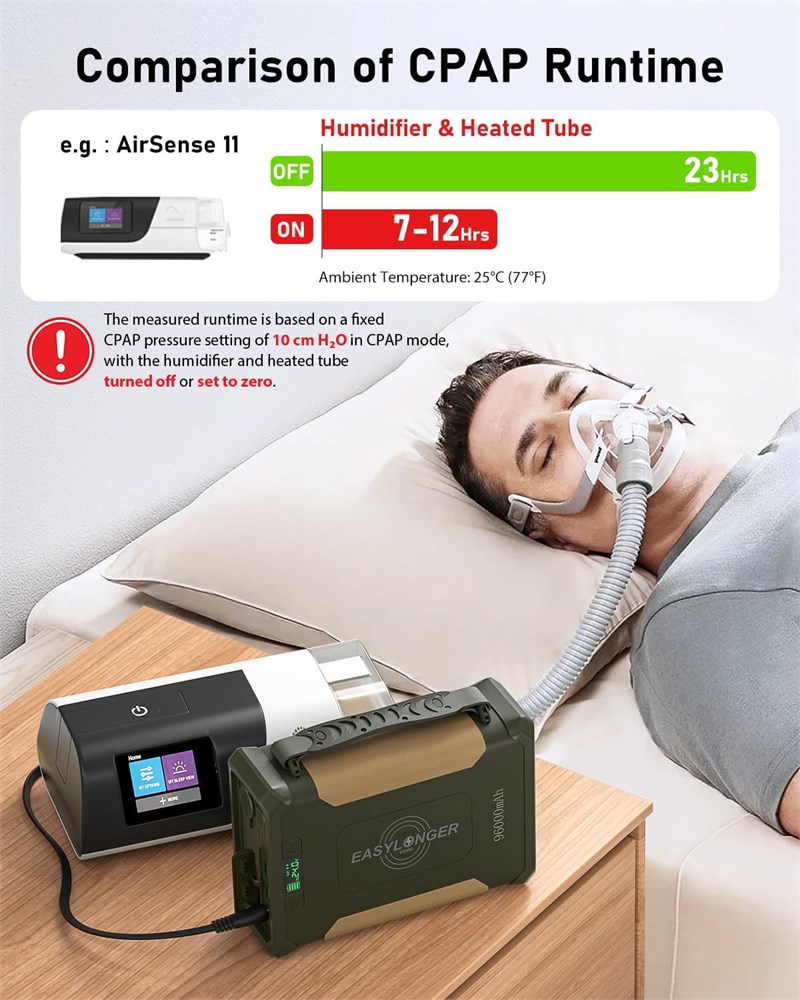 Off-Grid CPAP Battery: Includes 4 CPAP DC cables, compatible with ResMed S9, AirSense 10, AirSense 11, AirCurve 10, AirCurve 11, AirMini, Philips DreamStation, DreamStation 2, and Luna G3 Heater tube is not supported , etc 297.6Wh High Capacity: Powers your CPAP for about 2 nights or more during outages or camping with the humidifier and heated tube off. Note that using these features will reduce the run time Widely Compatible: Set the CPAP battery backup output to 24V and use a 5.5mm 2.1mm to 5.5mm 2.5mm DC cable (not included, sold separately) to power Sefam S Box, Resvent iBreeze, and Apex Medical iCH For Other CPAP Models: Use a cigarette lighter inverter or a cigarette lighter CPAP cable with a voltage converter to be compatible with F&P SleepStyle, L wenstein Prisma, Breas Z1/Z2, DreamStation GO, Transcend Micro Auto, Transcend 3 Auto, etc Versatile Power Station: The battery pack features 7 ports and 10W wireless charging, powers all portable devices, like car refrigerators, air pumps, and other devices under the power of 180W, laptops, tablets, phones, drones, Steam Deck, Switch, etc Safe and Stable: Built-in LiFePO4 cells that won't ignite under over-charge, over-discharge, over-current, or short-circuit conditions and can withstand high temperatures without decomposing, 3000 battery cycles Three Recharge Options: 1. Charge with a 60W Type-C PD charger (6-8 hours to full), 2. Charge with the included 72W AC adapter (5-6 hours to full), 3. Use a solar panel with 100W or more output (not included)