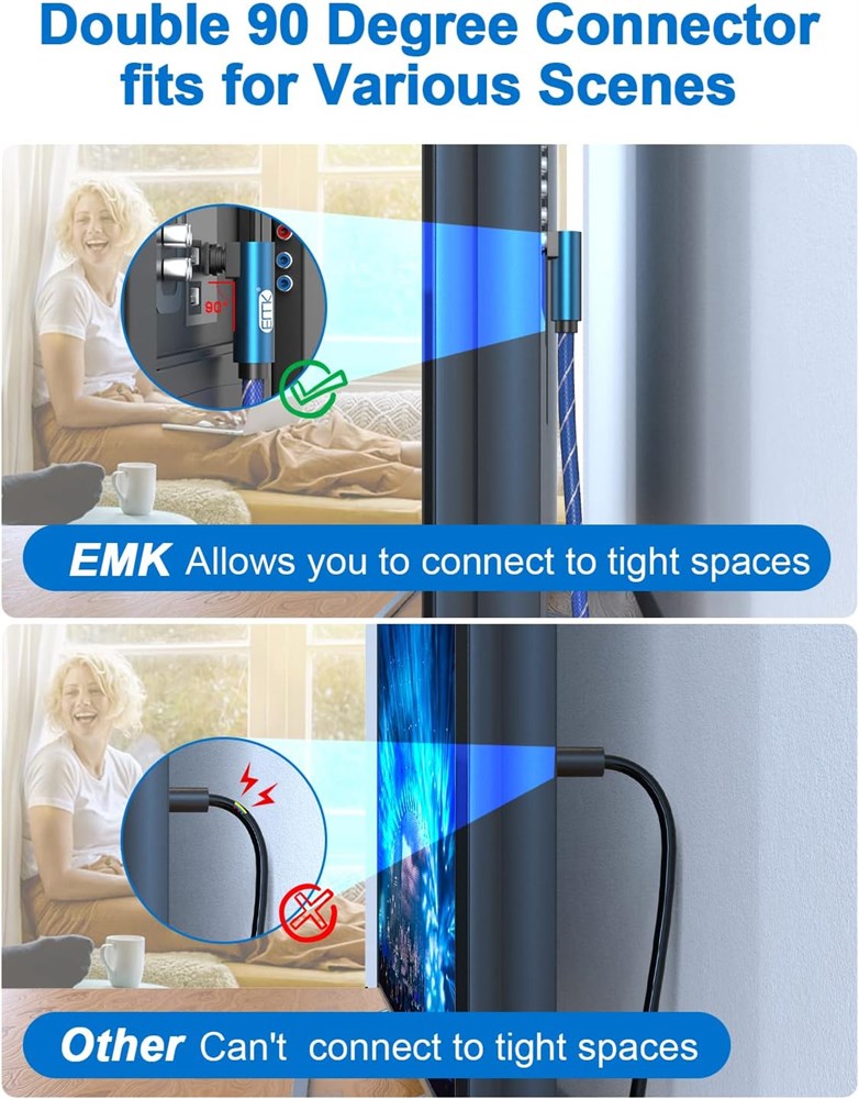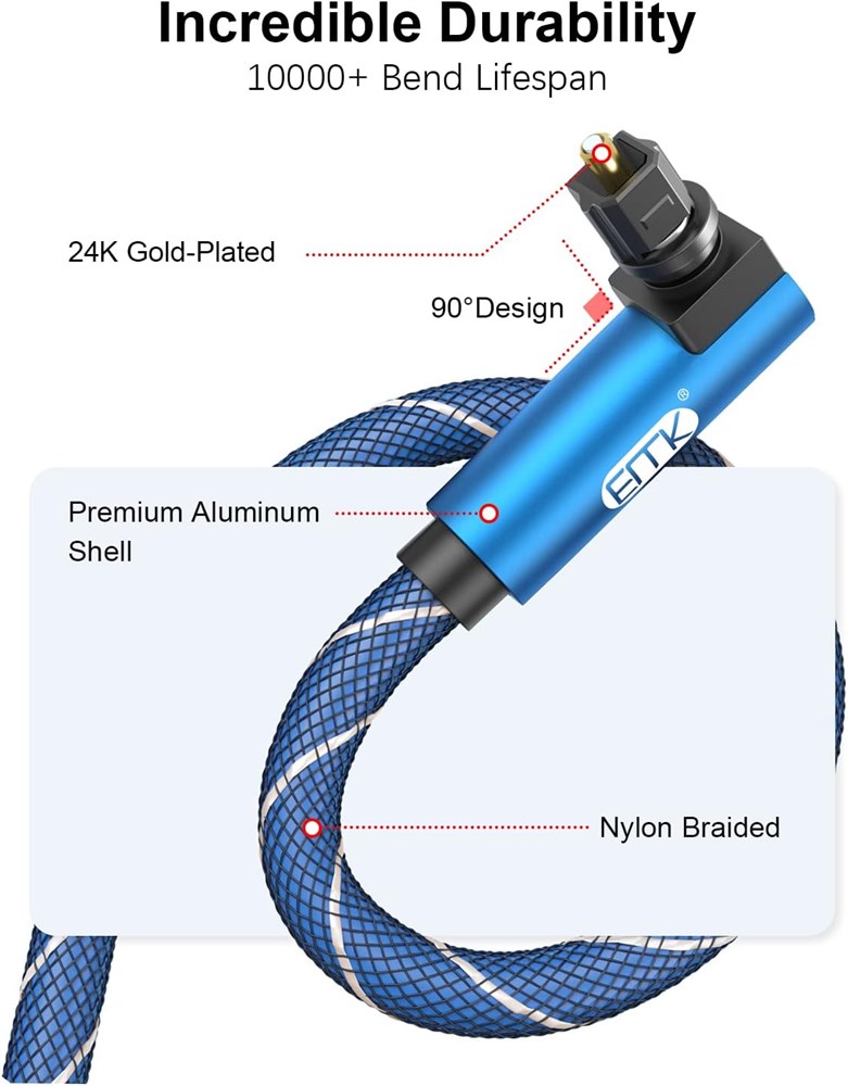 Upgrade dual 90 degree right Angle toslink optical Audio Cable: 360 degree right angle design makes the cable better fits for wall-mounted devices, solving the embarrassment of limited spaces between wall and device. 90 Degree/270 Degree/360 Degree swivel adjustable right angled. Super Sound Quality: EMK toslink optical cable transfers audio signal using light, gets rid of distortion and interference commonly found in traditional wire optical cables, support for uncompressed PCM audio and 5.1 to 7.1 surround sound systems including Dolby digital Plus, DTS-HD High Resolution and LPCM. Incredible Durability: High quality nylon jacket contributes to the (OD6.0mm) strain-relief construction that not only provides flexibility, but also protects the cable from kinks. Universal Compatibility: Compatible with all TOSLINK devices, such as Blu-ray player, computer, AV receiver, Roku, PS 3/4, Xbox One/360, Nintendo Wii, TV, HDTV, monitor, or projector. What You Get: 1* New Upgrade Dual 90 Degree Right Angle Toslink Optical Audio Cable.
