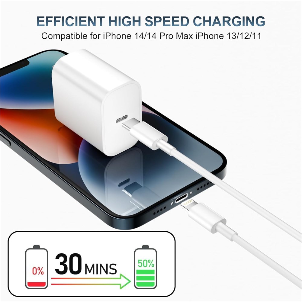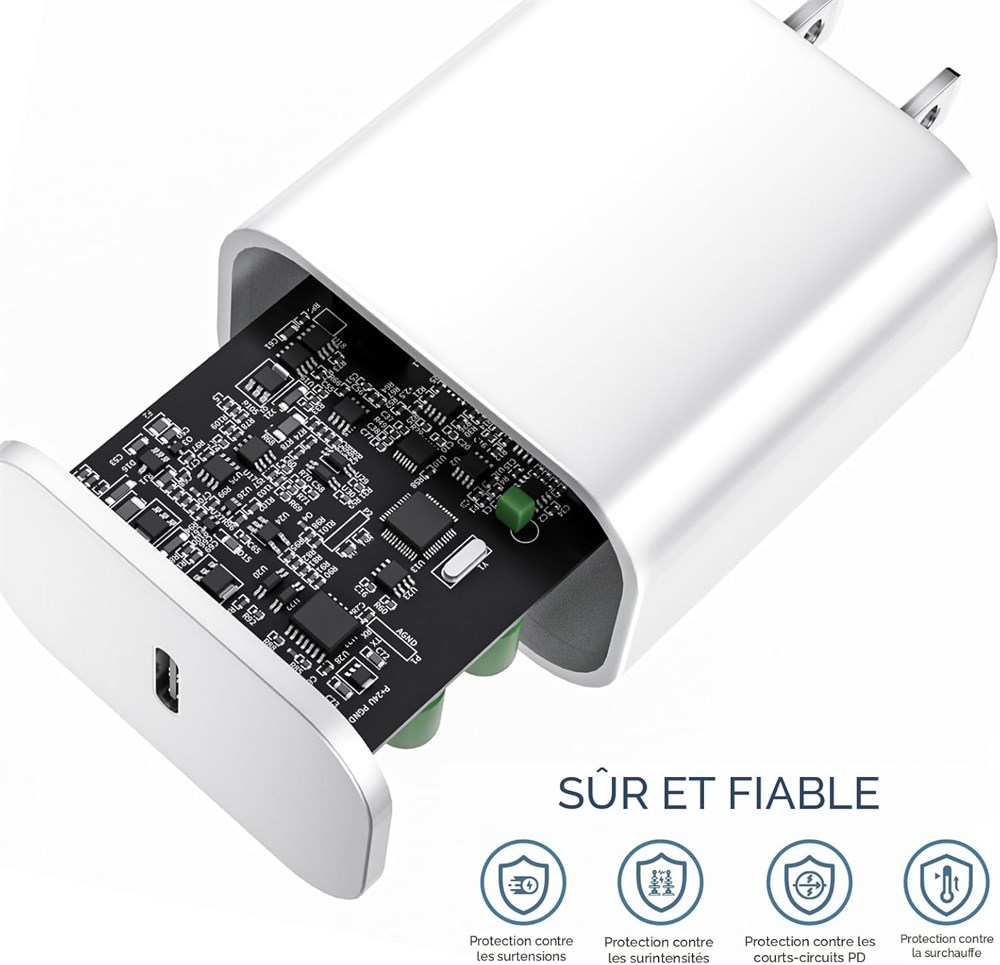C ble certifi MFi pour Apple : profitez d'une connectivit transparente et d'une performance fiable avec notre c ble certifi MFi pour Apple, des normes strictes en mati re de s curit , de compatibilit et de durabilit pour garantir une compatibilit 100 % avec tout appareil Lightning, m me lors de la publication de futures mises jour iOS. Chargeur rapide pour iPhone : ce chargeur de t l phone avec cordon de charge rapide de type C de 3 m est con u pour fournir une charge rapide pour vos appareils, charge le t l phone 12 13 14 jusqu' 50 % en seulement 30 minutes. Les chargeurs de t l phone 20 W atteignent jusqu' 4 fois plus rapidement que le chargeur de 5 W avec sa technologie avanc e, vous pouvez profiter de la commodit d'une charge rapide et efficace, vous permettant de rester connect et aliment tout au long de la journ e. Large compatibilit : notre chargeur mural USB C est compatible avec iPhone 14/14 Plus/14 Pro/14 Pro Max13/13 Mini/13 Pro/13 Pro Max/12/12Pro/12 Pro Max/12 Mini/11/11 Pro/11 Pro Max/SE 2020/XS Max/XS/X/XR/8 Plus. 8, Pad Pro/Pad. Air/Pad. Que vous ayez besoin de charger votre t l phone ou votre tablette, ce chargeur est capable de fournir une alimentation fiable et stable pour tous vos appareils. S curit sup rieure Ce chargeur de t l phone de 20 W dispose d'un syst me de s curit multipuissant comprenant une protection contre les courts-circuits, une protection contre les hautes tensions, etc., assure une protection compl te de vos appareils. Le chargeur mural certifi ETL avec protection contre les surtensions int gr e dispose d'une tension stable. C ble de charge rapide avec puce intelligente int gr e pour correspondre automatiquement au courant requis par les appareils pour prot ger vos appareils contre les surintensit s, les surtensions, les courts-circuits et la surchauffe. Contenu : 2 chargeurs rapides pour iPhone et 2 cordons de charge de t l phone de 1,8 m de long. - -
